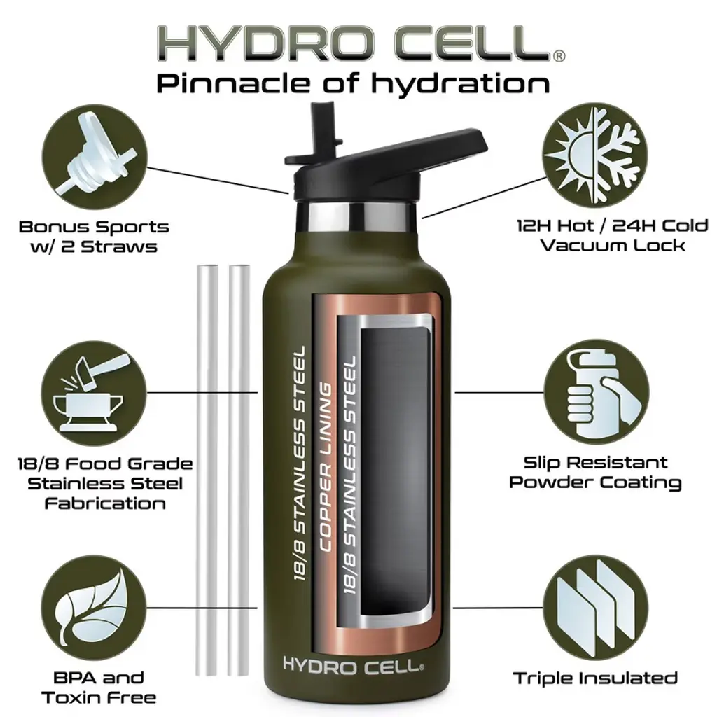 Stay hydrated and on the move with the best stainless steel water bottle for fitness, work, and outdoor adventures. Are you looking for a water bottle that keeps drinks ice cold or super-hot for hours on end for ultimate freshness? Then you need the Hydro Cell Stainless Steel Water Bottle crafted with a double-walled, vacuum-sealed design that holds in temperatures, eliminates condensation, and ensures all your favorite drinks taste better. Stylish and Durable The Hydro Cell is made for those who live for adventure or simply lead busy lives. Made with premium-grade stainless steel, our leakproof water bottles feature a standard-mouth top for adding ice cubes and easier drinking. What is more, it is versatile enough to use quickly after Yoga or CrossFit, durable enough to take to the beach or lake, and contemporary enough to use in the kitchen or to take to work. If you are looking for a multipurpose water bottle that keeps drinks ice cold in the summer and hot and delicious in the dead of winter, then you need the Hydro Cell Stainless Steel Water Bottle. Product Details: Premium Stainless Steel, Double-Walled and Vacuum Sealed, Keeps Drinks Cold for 24 Hours, Keeps Drinks Hot for 12 Hours, Leakproof Lid, BPA Free, Bottle comes with two caps: a screw-in cap and an additional sports cap with flip straw to ensure that your favorite beverages maintain the perfect temperatures, Hand Wash Only, Satisfaction Guaranteed.