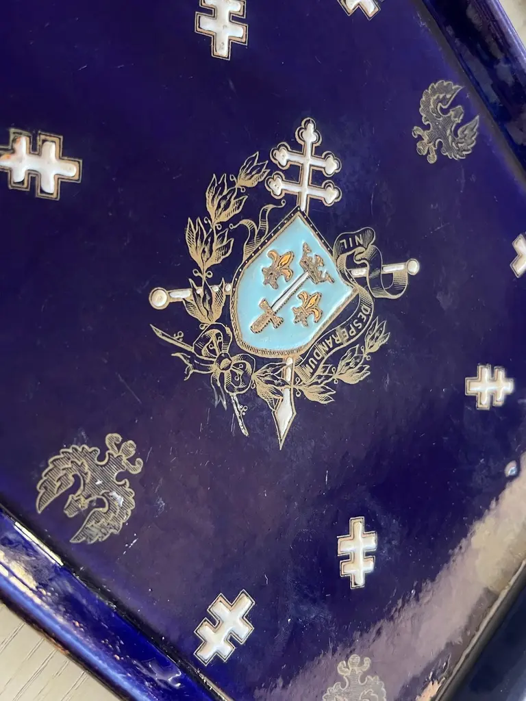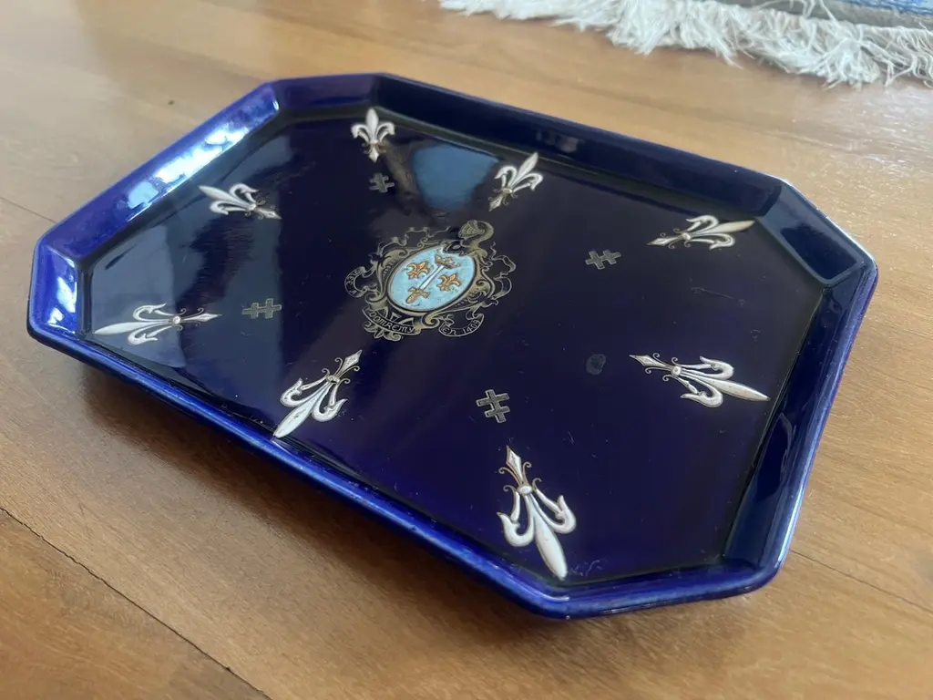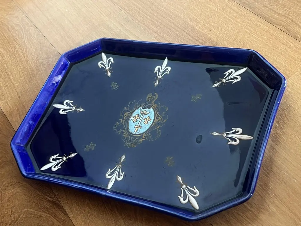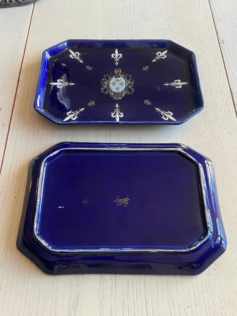 French handmade ceramic pieces in blue with hand made decoration.France, circa 1920
