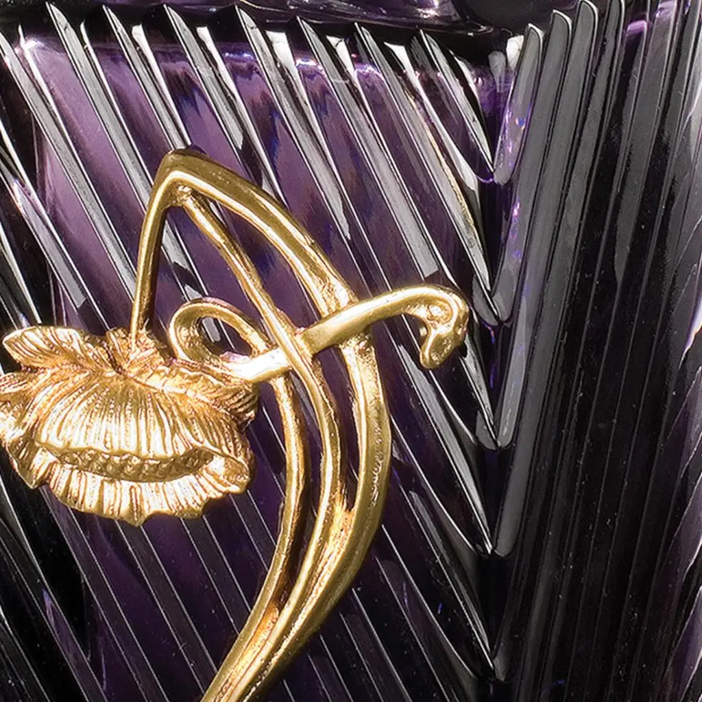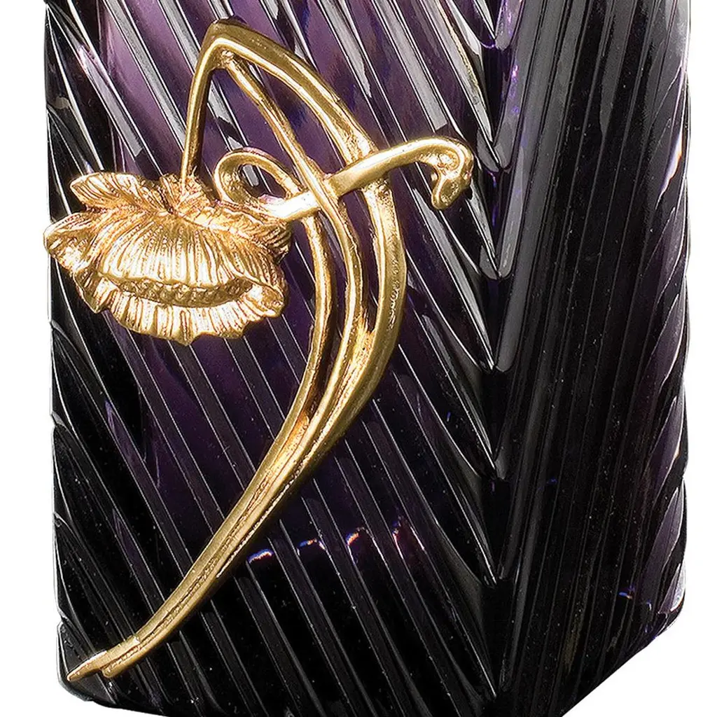 21st century Hand carved amethyst crystal and golden bronze whisky bottle. This bottle is finely chiseled lost wax castings . On request to customer can modificate the color of crystal: pink, amber, amethist etc... and we can change also the metal finishing: French gold, burnished, dark burnished, antique silver and patinated gold so you can match it with any decor. The style of this bottle is in Liberty style and can be inserted in the best possible way within every furniture.Each object is handcrafted and the care for every detail makes each item unique in its kind.Also Oggetti d'Arte will follow with the same passion the request of the most qualified studies of interior architecture from around the world, helping them in achievement of their most ambitious projects.