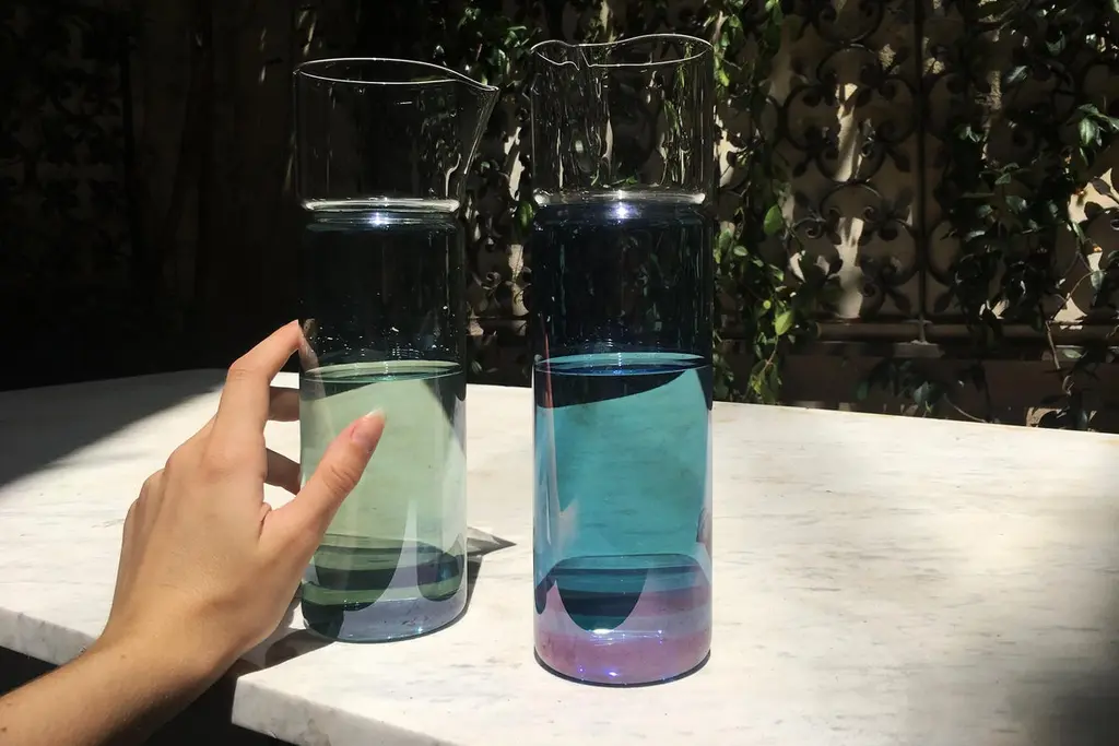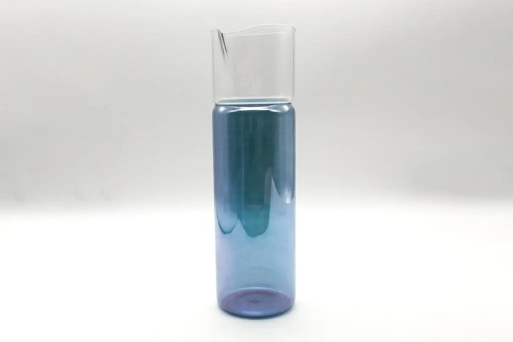 Carafe in borosilicate glass handmade by Venetian artisans, characterized by the blue color which creates a kaleidoscopic play of colored reflections. The color is applied by hand with a brush.It can contain up to 75 cl of liquid.