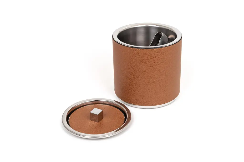 This ice bucket is an essential piece of equipment in any home or commercial bar.The combination of chrome-plated steel and calf leather is particularly charming and the practical lid also provides additional insulation. Available in several kinds of leathers and colors is sure to add a touch of style.