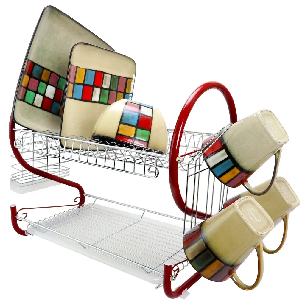 Simplify the task of drying your dishes with this fantastic Dish Rack! This rack holds all your hand-washables so drying is organized and efficient. This rack features a utensil holder, plastic draining tray, two tiers, slots for plates and space for cups and bowls. In stylish chrome finish. The dish rack has a bottom plastic tray that will collect the water from the dishes while its being air dried. With the open wire concept, the dishes get dried faster with the better airflow to dry better. * Made of iron wire * Chrome plated * Includes one dish rack * Includes one plastic draining tray * Includes one stainless utensil holder * Section to hold glasses * Two tier design