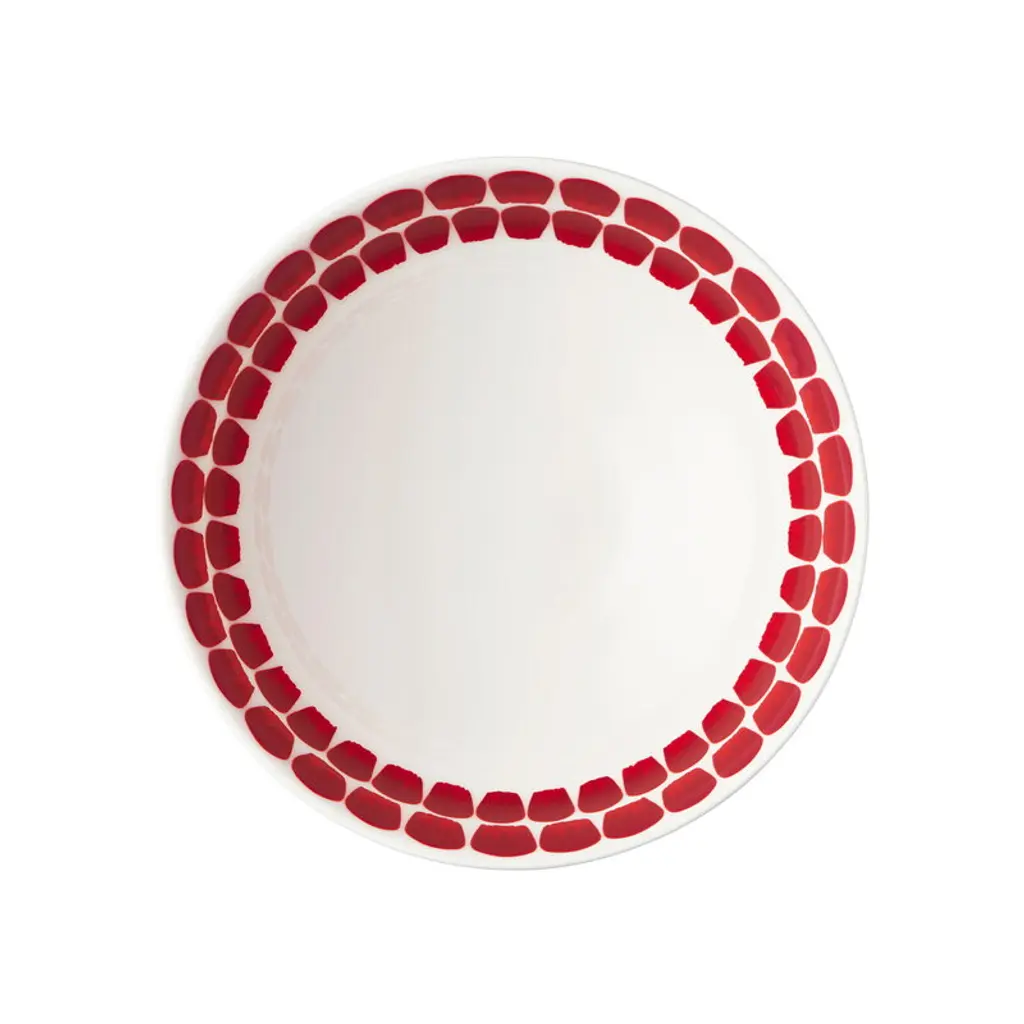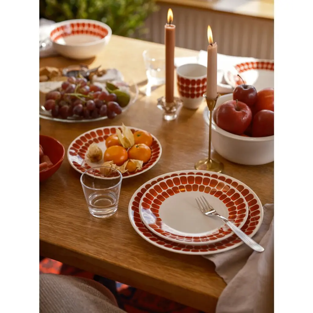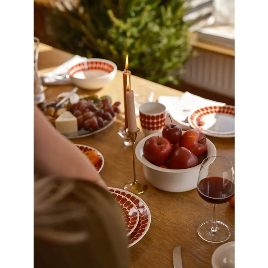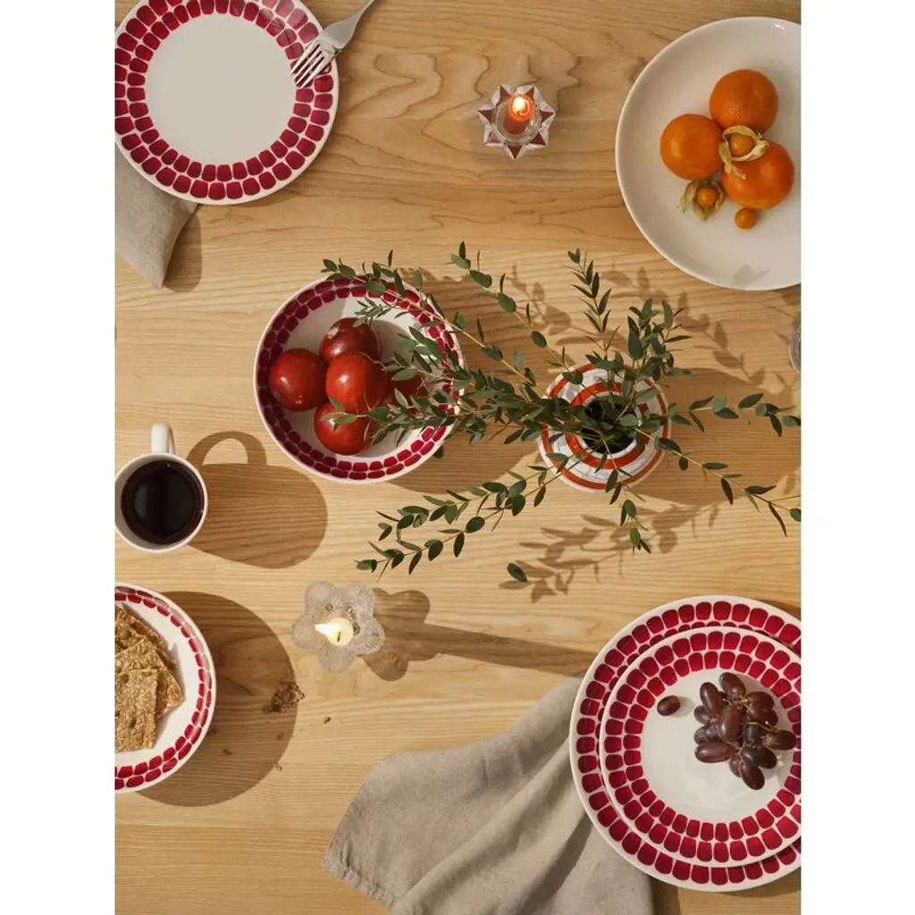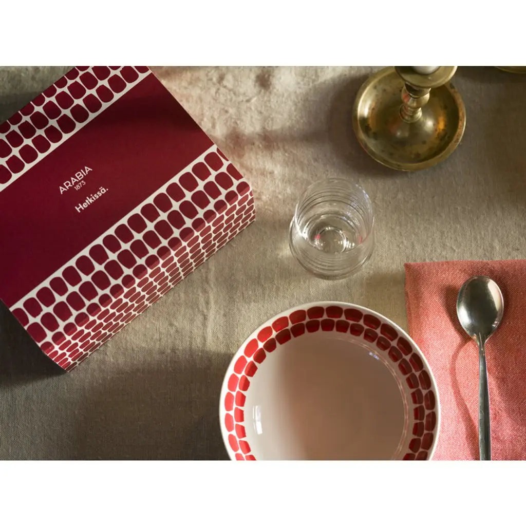 24h Tuokio tableware range is based on the popular 24h series from Heikki Orvola and the decoration is by Helorinne & Kallio. Originally designed by designer Heikki Orvola for his own use, 24h found its way to Arabia assortment in 1996. Finnish designer duo Helorinne & Kallio were given a brief to get inspired by Arabia’s strong tradition in ceramic pattern making and to make a fresh pattern suited for today’s consumers. They found inspiration for Tuokio from Arabia’s strong expertise in ceramics and took advantage of the opportunity to learn from the best professionals in the field at the Arabia factory. The special edition 24h Tuokio plate in red is available for a limited time only.
