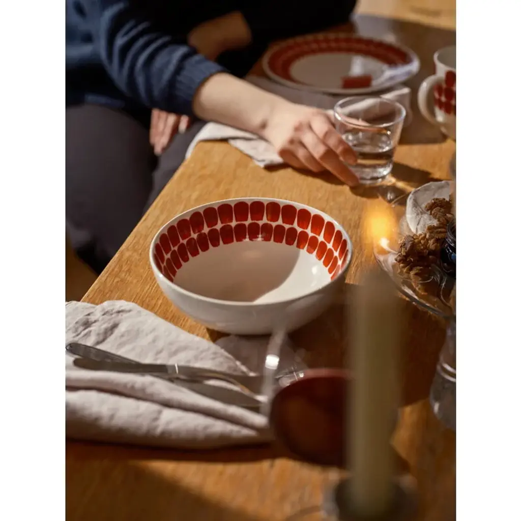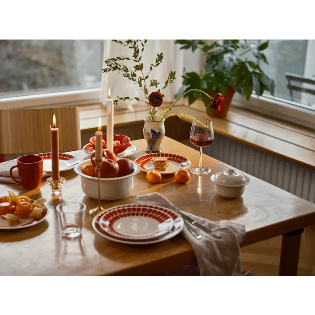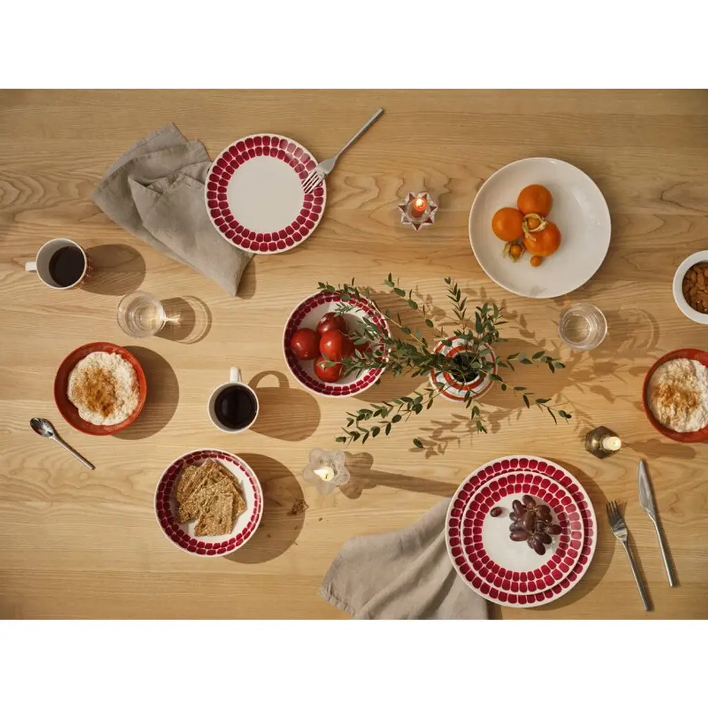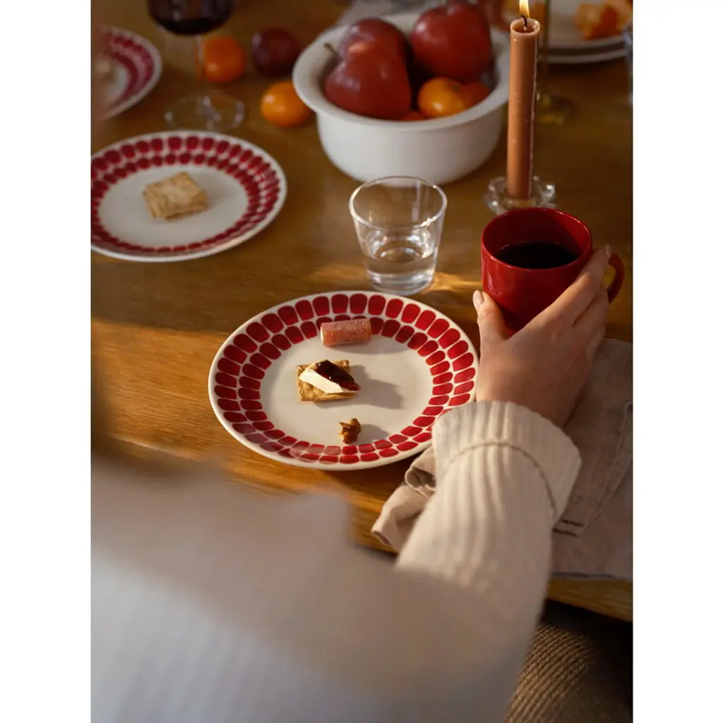 Arabia's 24h Tuokio plate is adorned with a lovely decoration by design studio Helorinne & Kallio, inspired by Arabia’s expertise in ceramics and the brand's strong tradition in ceramic pattern making, in particular. The Tuokio pattern is fresh yet nostalgic, delicate yet full of character. The designers aimed for the impression of the pattern being painted by hand as an homage to classic ceramic patterns. This also gives the pattern a rhythm and a distinctive artistic air. The pattern was created to accentuate the simple, soft lines of the 24h tableware range designed by Heikki Orvola. Originally created for the designer's own use, 24h found its way to the Arabia assortment in 1996, and it has been a firm favorite among fans of functional design ever since. The name 24h refers to the versatility of the range: 24h – tableware for every hour of the day. Tuokio, in turn, is Finnish for "moment" and refers to the fleeting nature of time. The special edition 24h Tuokio plate in red is available for a limited time only.