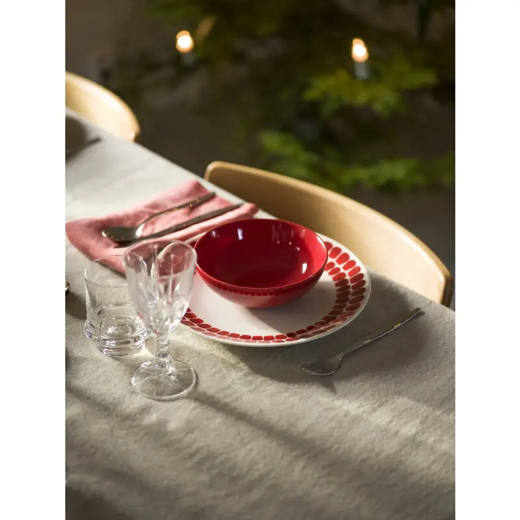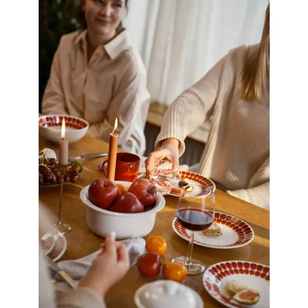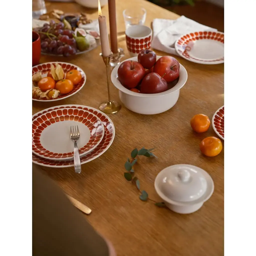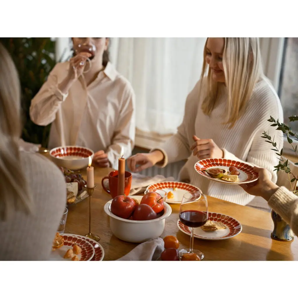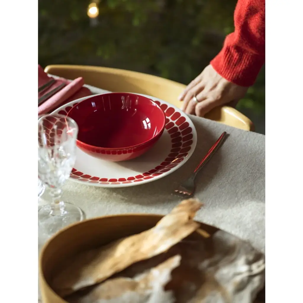Arabia's 24h Tuokio plate is adorned with a lovely decoration by design studio Helorinne & Kallio, inspired by Arabia’s expertise in ceramics and the brand's strong tradition in ceramic pattern making, in particular. The Tuokio pattern is fresh yet nostalgic, delicate yet full of character. The designers aimed for the impression of the pattern being painted by hand as an homage to classic ceramic patterns. This also gives the pattern a rhythm and a distinctive artistic air. The pattern was created to accentuate the simple, soft lines of the 24h tableware range designed by Heikki Orvola. Originally created for the designer's own use, 24h found its way to the Arabia assortment in 1996, and it has been a firm favorite among fans of functional design ever since. The name 24h refers to the versatility of the range: 24h – tableware for every hour of the day. Tuokio, in turn, is Finnish for "moment" and refers to the fleeting nature of time. The special edition 24h Tuokio plate in red is available for a limited time only.