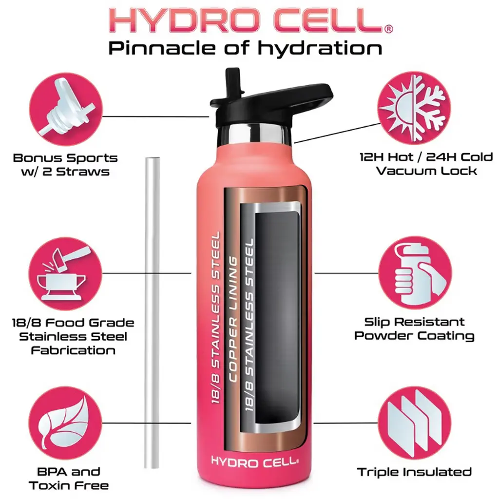 Stay hydrated and on the move with the best stainless steel water bottle for fitness, work, and outdoor adventures. Are you looking for a water bottle that keeps drinks ice cold or super-hot for hours on end for ultimate freshness? Then you need the Hydro Cell Stainless Steel Water Bottle crafted with a double-walled, vacuum-sealed design that holds in temperatures, eliminates condensation, and ensures all your favorite drinks taste better. Stylish and Durable The Hydro Cell is made for those who live for adventure or simply lead busy lives. Made with premium-grade stainless steel, our leakproof water bottles feature a standard-mouth top for adding ice cubes and easier drinking. What is more, it is versatile enough to use quickly after Yoga or CrossFit, durable enough to take to the beach or lake, and contemporary enough to use in the kitchen or to take to work. If you are looking for a multipurpose water bottle that keeps drinks ice cold in the summer and hot and delicious in the dead of winter, then you need the Hydro Cell Stainless Steel Water Bottle. Product Details: Premium Stainless Steel, Double-Walled and Vacuum Sealed, Keeps Drinks Cold for 24 Hours, Keeps Drinks Hot for 12 Hours, Leakproof Lid, BPA Free, Bottle comes with two caps: a screw-in cap and an additional sports cap with flip straw to ensure that your favorite beverages maintain the perfect temperatures, Hand Wash Only, Satisfaction Guaranteed.