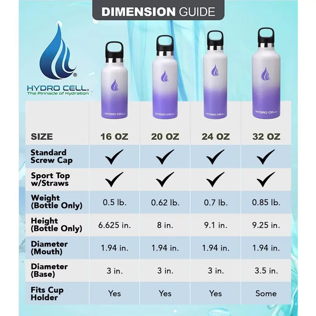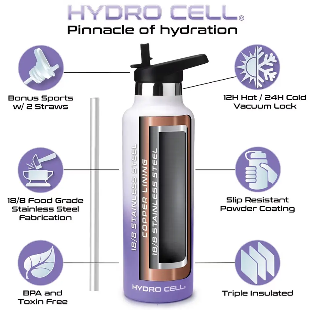 Stay hydrated and on the move with the best stainless steel water bottle for fitness, work, and outdoor adventures. Are you looking for a water bottle that keeps drinks ice cold or super-hot for hours on end for ultimate freshness? Then you need the Hydro Cell Stainless Steel Water Bottle crafted with a double-walled, vacuum-sealed design that holds in temperatures, eliminates condensation, and ensures all your favorite drinks taste better. Stylish and Durable The Hydro Cell is made for those who live for adventure or simply lead busy lives. Made with premium-grade stainless steel, our leakproof water bottles feature a standard-mouth top for adding ice cubes and easier drinking. What is more, it is versatile enough to use quickly after Yoga or CrossFit, durable enough to take to the beach or lake, and contemporary enough to use in the kitchen or to take to work. If you are looking for a multipurpose water bottle that keeps drinks ice cold in the summer and hot and delicious in the dead of winter, then you need the Hydro Cell Stainless Steel Water Bottle. Product Details: Premium Stainless Steel, Double-Walled and Vacuum Sealed, Keeps Drinks Cold for 24 Hours, Keeps Drinks Hot for 12 Hours, Leakproof Lid, BPA Free, Bottle comes with two caps: a screw-in cap and an additional sports cap with flip straw to ensure that your favorite beverages maintain the perfect temperatures, Hand Wash Only, Satisfaction Guaranteed.