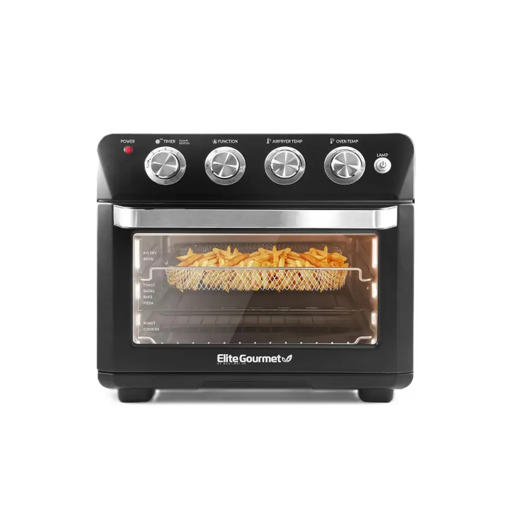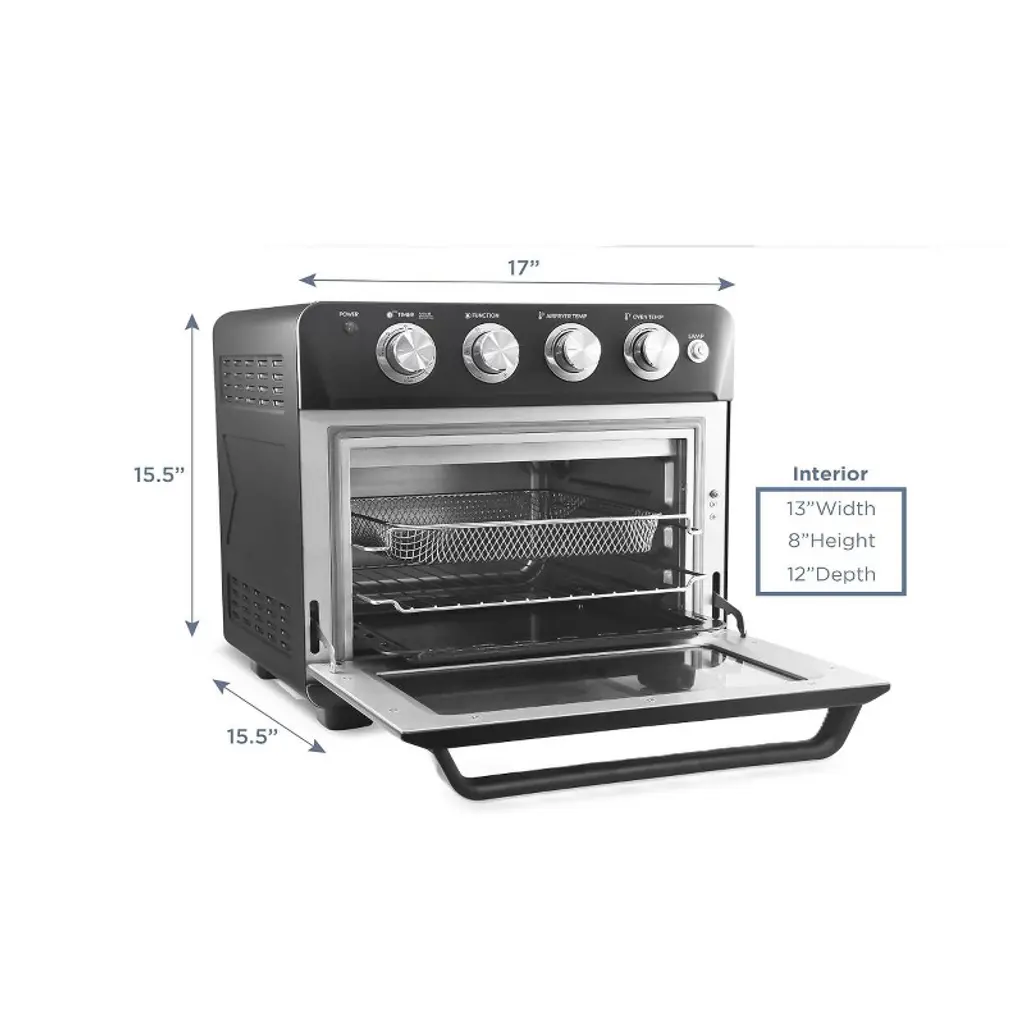 A countertop oven with air frying and other cooking capability. Multiple functions: Bake Broil roast Air fry Dehydrate Rotisserie. 4 Knob control panel. Two thermostat knobs offer separate air fry and oven control. 6 Stainless steel heating elements - 4 upper 2 lower. High and low speed fan motor. 120-Minute timer with stay on function. Provides 25-liters of cooking capacity. Powered by 1640 watts. Dimensions: 16.9" x 15.9" x 15.6. Includes: Bake tray. Wire rack. Crumb tray. Fry basket.