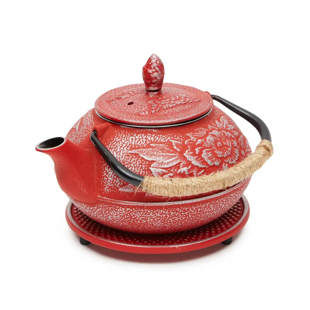 27 Oz Red Japanese Cast Iron Teapot Set, Loose Leaf Tetsubin With Handle, Infuser, Trivet (800 Ml) - Red