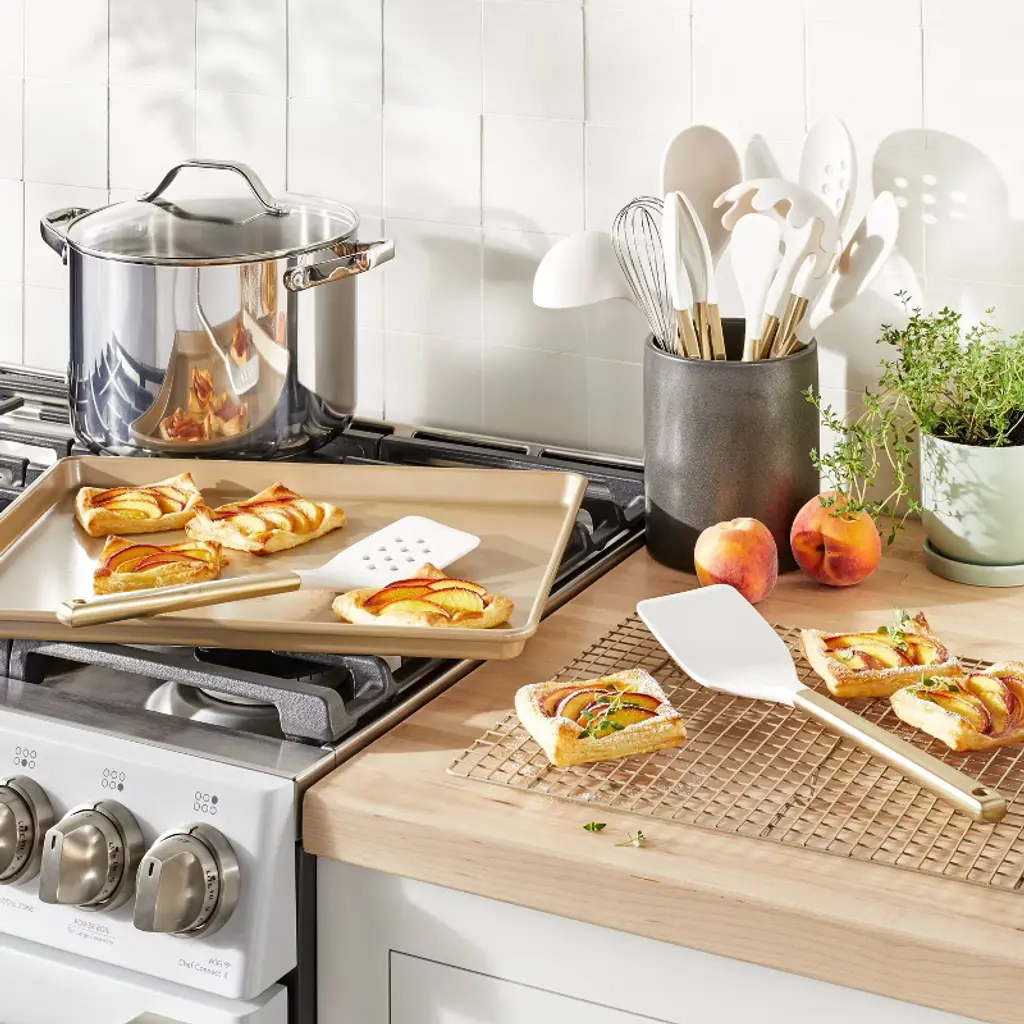 Give your bakeware a versatile update with a glam touch with this 2-Piece Nonstick Baking Sheet and Cooling Rack Set from Figmint™. This two-piece set includes a baking sheet and cooling rack, both with smooth, easy-to-clean nonstick surfaces. The sheet is made with wire-reinforced aluminized steel that heats evenly and resists warping, and both of the pieces are dishwasher safe and oven safe up to 450 degrees Fahrenheit.Figmint™: Mixing up a taste of adventure every day.Sheet interior dimensions: 12.4375 Inches x 16.14 Inches
