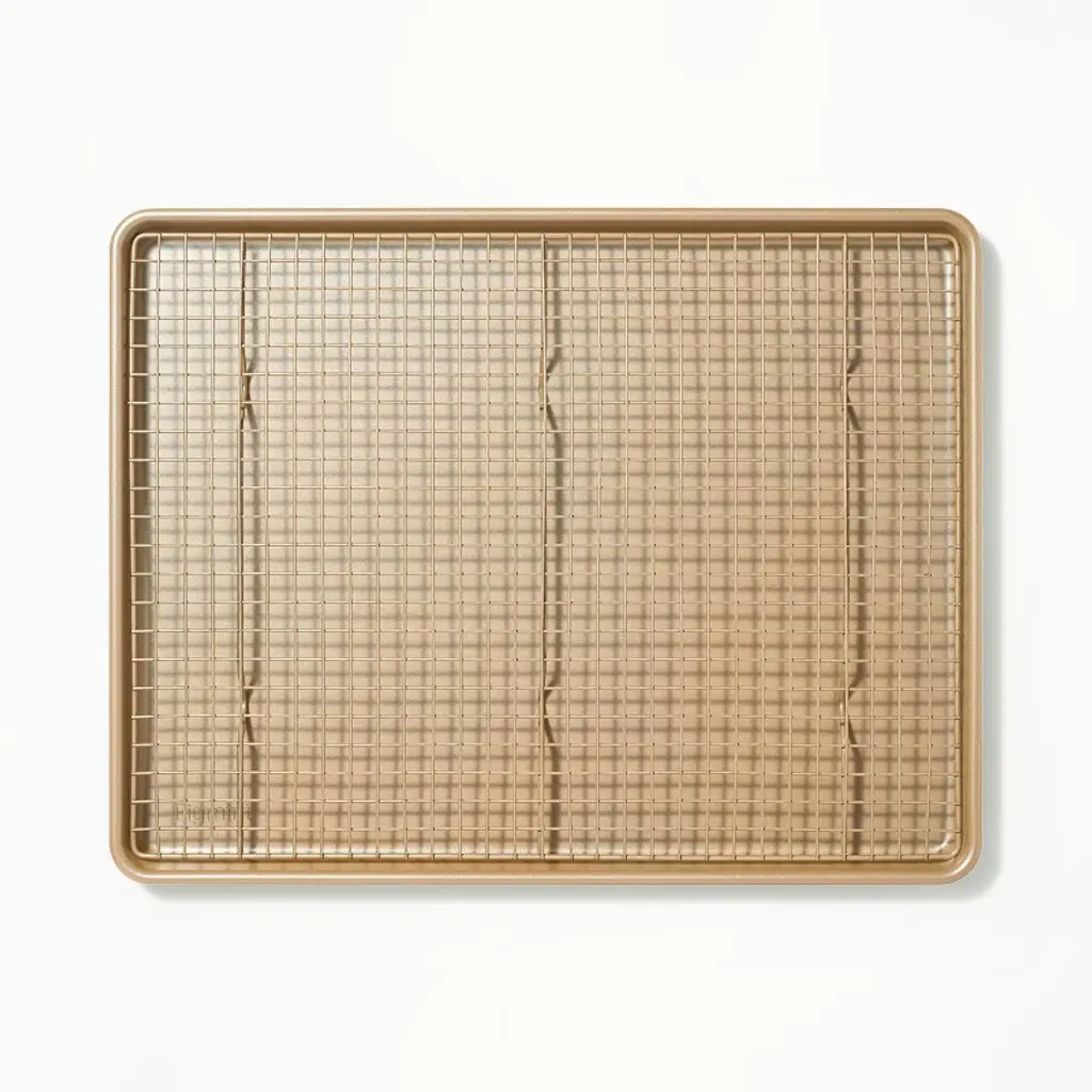 Give your bakeware a versatile update with a glam touch with this 2-Piece Nonstick Baking Sheet and Cooling Rack Set from Figmint™. This two-piece set includes a baking sheet and cooling rack, both with smooth, easy-to-clean nonstick surfaces. The sheet is made with wire-reinforced aluminized steel that heats evenly and resists warping, and both of the pieces are dishwasher safe and oven safe up to 450 degrees Fahrenheit.Figmint™: Mixing up a taste of adventure every day.Sheet interior dimensions: 12.4375 Inches x 16.14 Inches