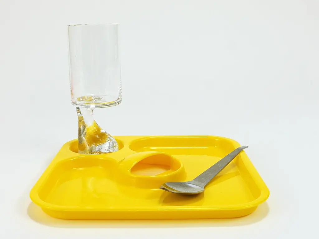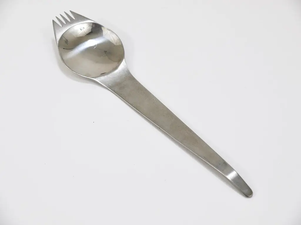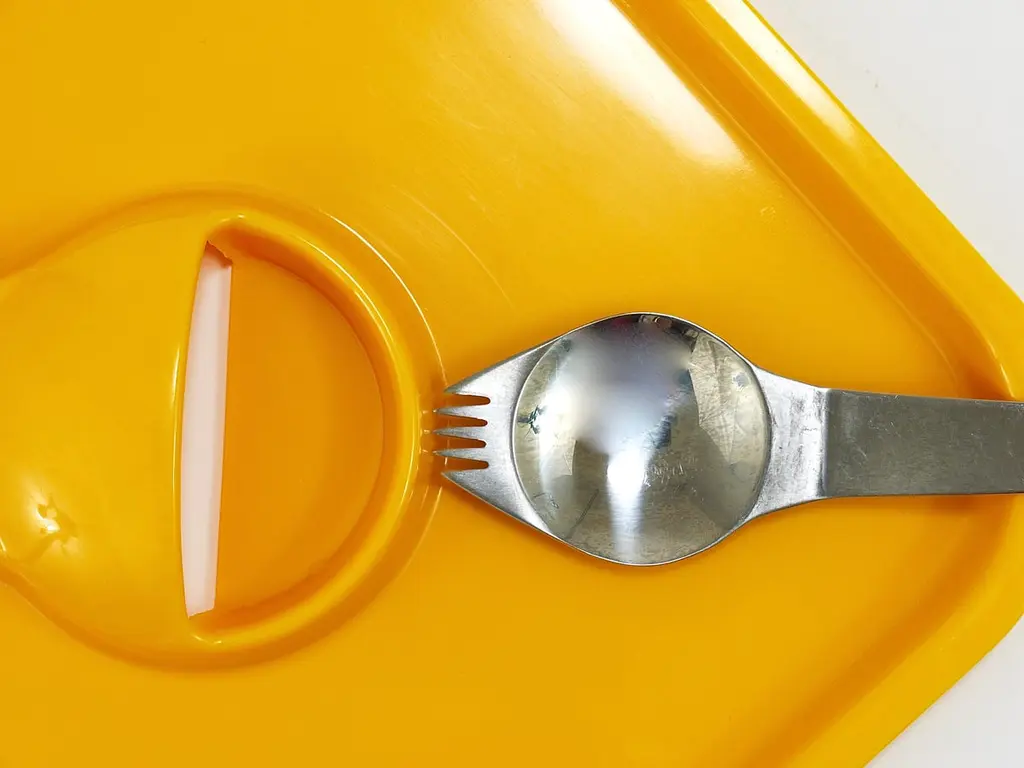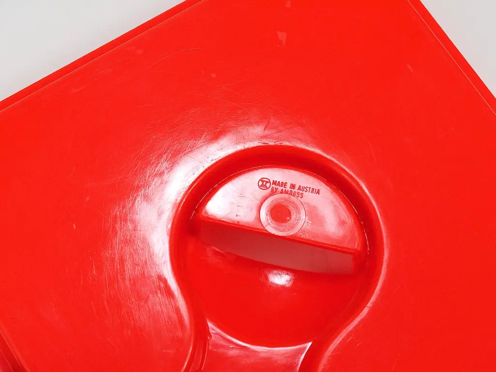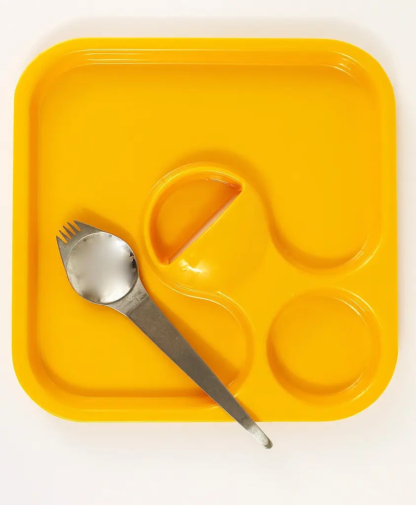 Up to three very nice stackable party sets, „Partypalette“, model K70, consisting of square plates plus spork, a combination of spoon and fork (Göffel). Designed by Ernst Otto Loewe, made by Amboss Neuzeughammer / Austria in the 1970s. The plates are made of plastic, the sporks are made of stainless steel. Designed for stand-up parties, the party plate is held like an artist's palette by putting the thumb through the opening in the centre. With the spork party food could be eaten with one hand. The round recess is for holding a glass. The Partypalette has been awarded at the European design competition in 1970. The plates and sporks are fully marked. There are two yellow/orange plates and one orange/red plate available. The plates are in very good condition with marginal signs of wear and the flatware shows age-related signs of wear, but also nothing major. We offer up to 13 additional sporks in our other listings. The displayed glass ist not included.