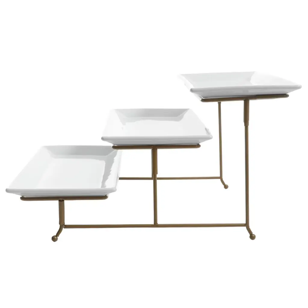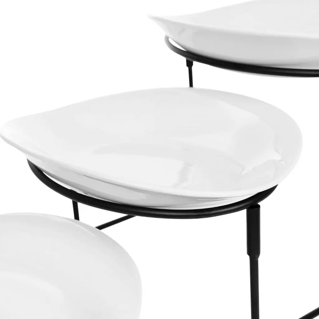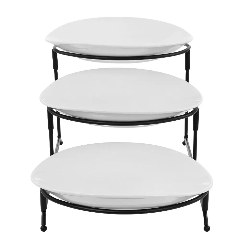 Show off your party etiquette with the Elama 3 Tier Oval Plate Porcelain Serveware Set. This serving set comes with three medium sized plates designed at an incline for easy access to all tiers. Use this serving set to serve before dinner snacks or after meal confections for your guests. Designed with a modern and sleek look, this tiered serving set will go perfectly with your home decor and any place setting. Constructed with a sturdy metal rack that holds the three porcelain plates snugly. Each plate has a raised side rim to keep food in place. This serving set is perfect for parties or for every day countertop storage use!