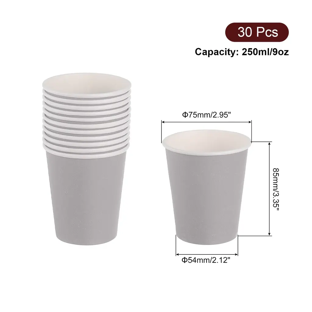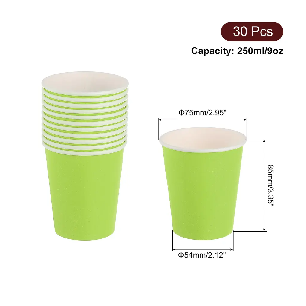 [Disposable and Convenient]: Made of thick paper, sturdy and durable and not easy to fade, after the party, just throw them away for quick and easy cleanup.[DIY Paper Cups]: Our disposable paper cups are perfect for DIY tools and sports stacking cups, let your paint or decorate these paper cups with favorite colors and designs, unleash their creativity.[ Party Cups]: Use these colorful paper cups to make your birthday party or any special occasion extra special, you can complete this craft with your family and friends, giving you the opportunity to connect with your family and friends and enjoy a happy time together.[Wide Range of Uses]: These cups can be used not only for parties, but also for daily activities such as tea parties, picnics, and even art and craft projects, the possibilities of these versatile cups are endless.Specification:Capacity: 250ml/9ozHeight: 85mm/3.35"Bottom: 54mm/2.12"Diameter: 75mm/2.95"Material: PaperColor:RedPackage Contents:30Pcs x Disposable Paper Cups