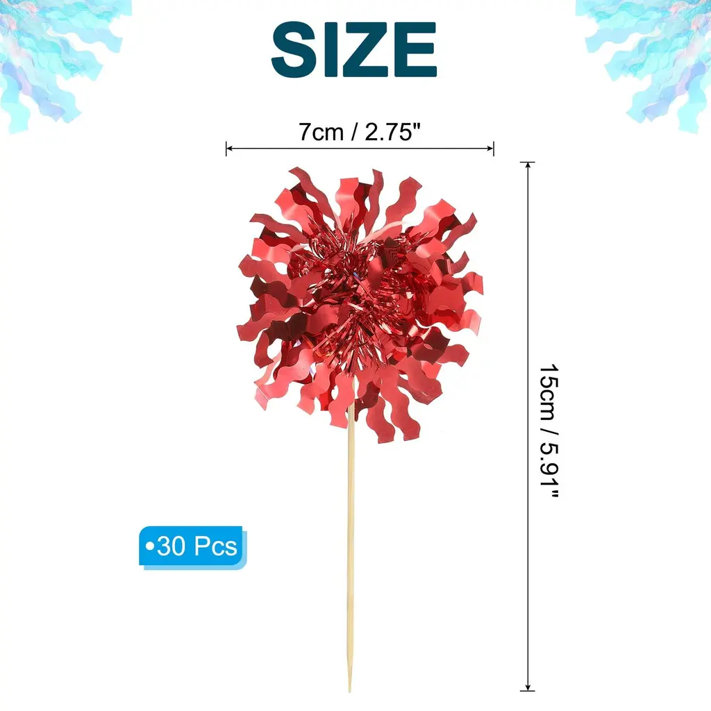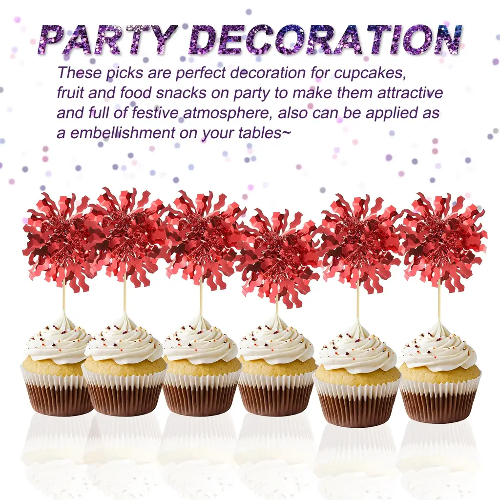 Make your desserts shine with our Firework Cupcake Toppers! Perfect for a variety of celebrations, these vibrant and fun cupcake decorations are sure to welcome your guests.SpecificationColor: RedMaterial: FoilFirework Cupcake Toppers Size: 15 x 7mm / 0.59 x 0.28 inchesPacking List: 30 Pcs Firework Cupcake ToppersAdvantageMade of good quality foil paper and bamboo stick, not easy to deform and fade, smooth edges without burrs. They will shine in the light, easily enhance the party, and draw people's attention.Assorted ColorsYou will get a lot of sparkle Pink foil firework cupcake toppers, make your cake more shinny and beatiful~NotePlease check the size and color before choosing our products so that you can get suitable results for your keys.