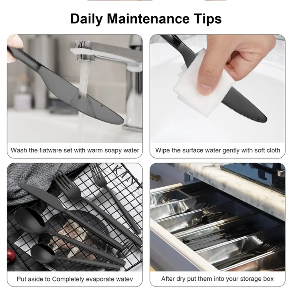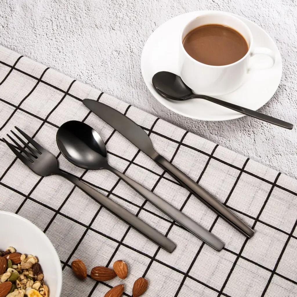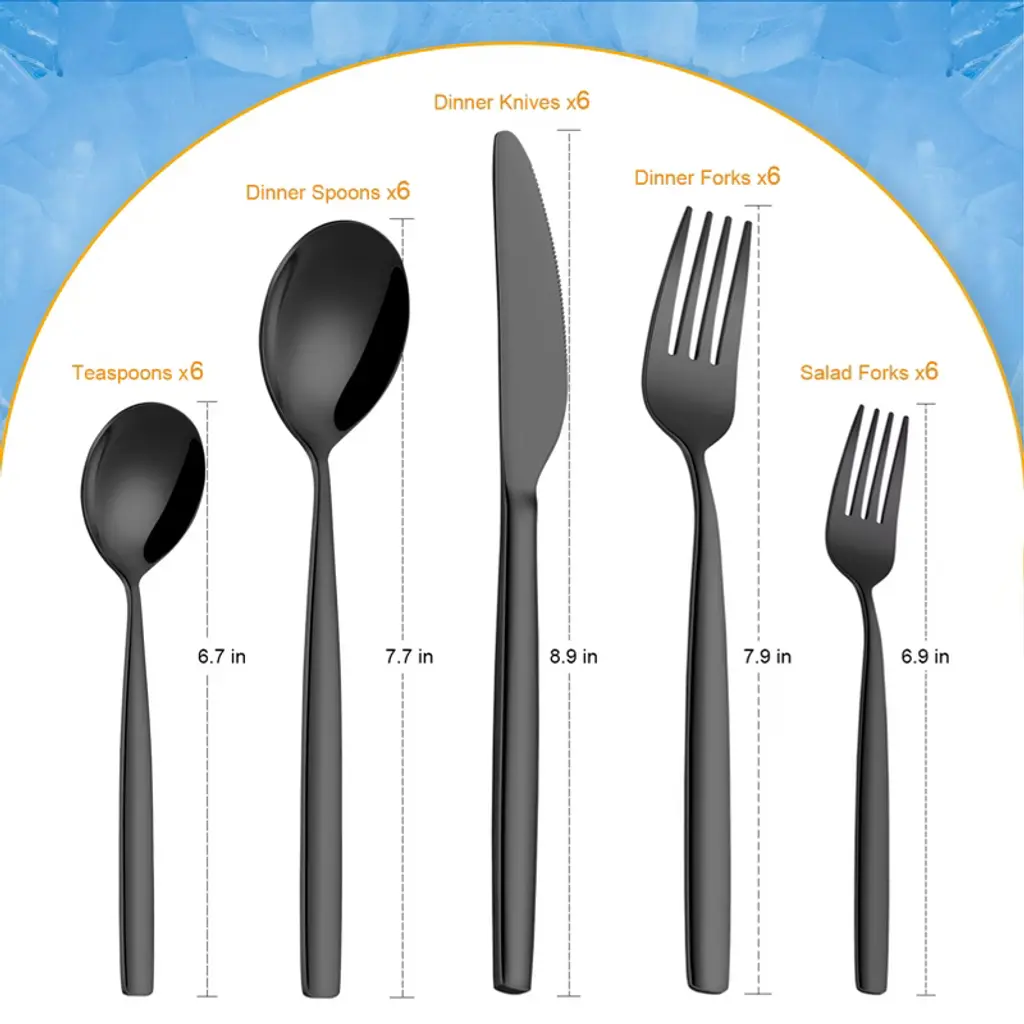 Product DescriptionName: Flatware SetMaterial: Stainless steelSize: Main cutter Steak cutter 22cm/8.7"; Main cutter 22.6cm/8.9"; Main Fork 20cm/7.9"; Main Spoon 19.5cm/7.7"; Salad Fork 17.5cm/6.9"; Teaspoon 17cm/6.7".Packaging: BoxedPacking list:Main table knife*6Main table fork*6Main table spoon*6Salad fork*6Tea spoon*6Note:Different displays may cause the color of the item in the picture a little different from the real thing.Manual measuring,please allow 1~3mm error,thank you.