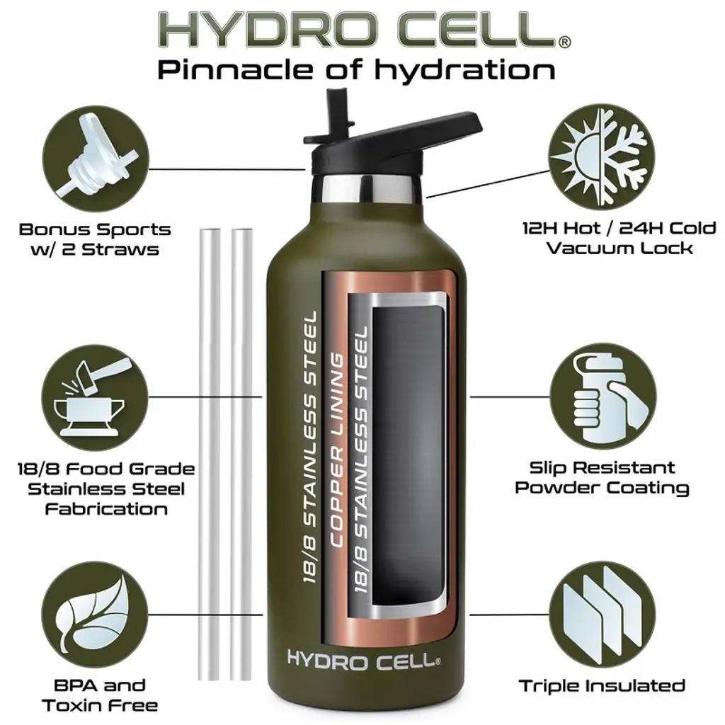 Stay hydrated and on the move with the best stainless steel water bottle for fitness, work, and outdoor adventures. Are you looking for a water bottle that keeps drinks ice cold or super-hot for hours on end for ultimate freshness? Then you need the Hydro Cell Stainless Steel Water Bottle crafted with a double-walled, vacuum-sealed design that holds in temperatures, eliminates condensation, and ensures all your favorite drinks taste better. Stylish and Durable The Hydro Cell is made for those who live for adventure or simply lead busy lives. Made with premium-grade stainless steel, our leakproof water bottles feature a standard-mouth top for adding ice cubes and easier drinking. What is more, it is versatile enough to use quickly after Yoga or CrossFit, durable enough to take to the beach or lake, and contemporary enough to use in the kitchen or to take to work. If you are looking for a multipurpose water bottle that keeps drinks ice cold in the summer and hot and delicious in the dead of winter, then you need the Hydro Cell Stainless Steel Water Bottle. Product Details: Premium Stainless Steel, Double-Walled and Vacuum Sealed, Keeps Drinks Cold for 24 Hours, Keeps Drinks Hot for 12 Hours, Leakproof Lid, BPA Free, Bottle comes with two caps: a screw-in cap and an additional sports cap with flip straw to ensure that your favorite beverages maintain the perfect temperatures, Hand Wash Only, Satisfaction Guaranteed.