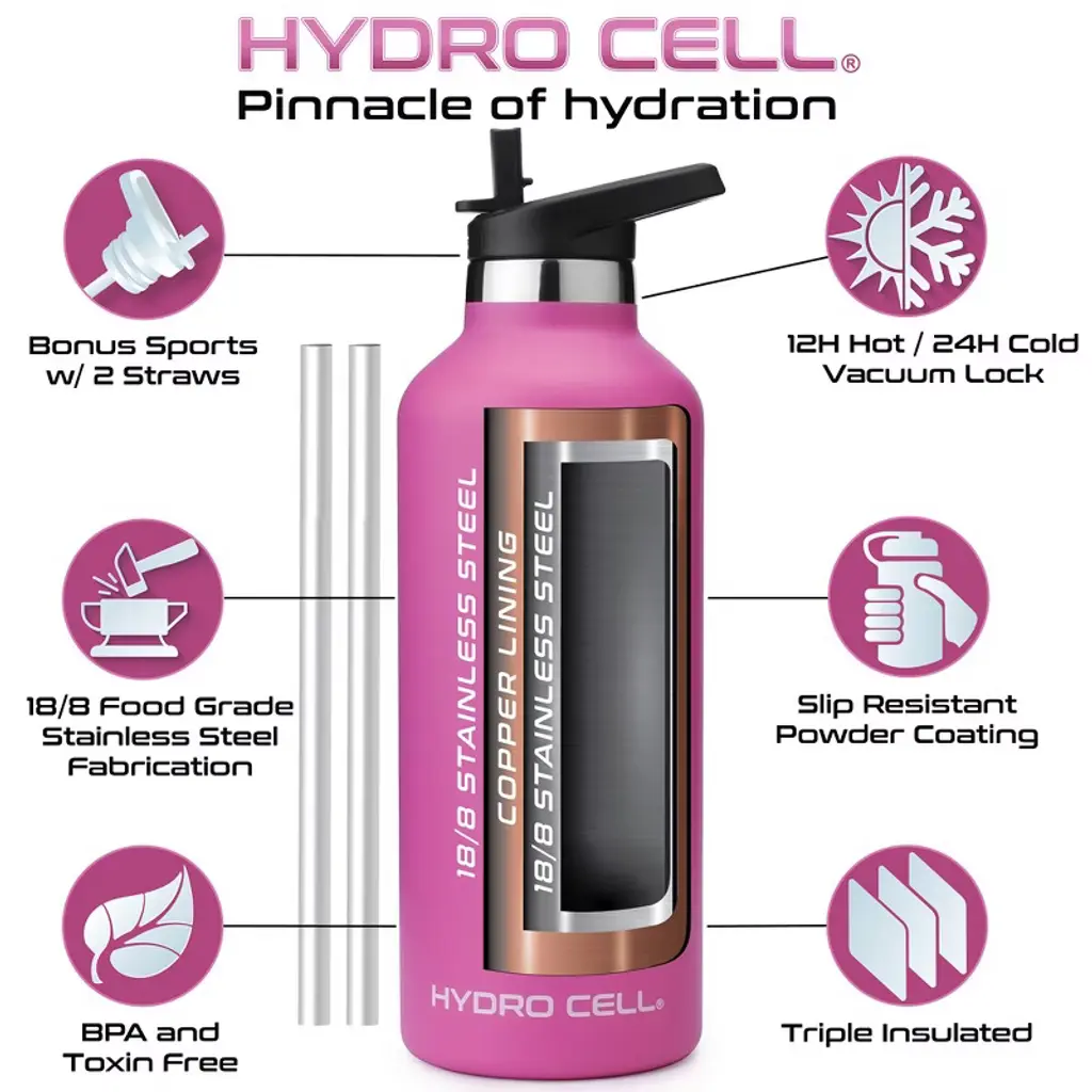 Stay hydrated and on the move with the best stainless steel water bottle for fitness, work, and outdoor adventures. Are you looking for a water bottle that keeps drinks ice cold or super-hot for hours on end for ultimate freshness? Then you need the Hydro Cell Stainless Steel Water Bottle crafted with a double-walled, vacuum-sealed design that holds in temperatures, eliminates condensation, and ensures all your favorite drinks taste better. Stylish and Durable The Hydro Cell is made for those who live for adventure or simply lead busy lives. Made with premium-grade stainless steel, our leakproof water bottles feature a standard-mouth top for adding ice cubes and easier drinking. What is more, it is versatile enough to use quickly after Yoga or CrossFit, durable enough to take to the beach or lake, and contemporary enough to use in the kitchen or to take to work. If you are looking for a multipurpose water bottle that keeps drinks ice cold in the summer and hot and delicious in the dead of winter, then you need the Hydro Cell Stainless Steel Water Bottle. Product Details: Premium Stainless Steel, Double-Walled and Vacuum Sealed, Keeps Drinks Cold for 24 Hours, Keeps Drinks Hot for 12 Hours, Leakproof Lid, BPA Free, Bottle comes with two caps: a screw-in cap and an additional sports cap with flip straw to ensure that your favorite beverages maintain the perfect temperatures, Hand Wash Only, Satisfaction Guaranteed.