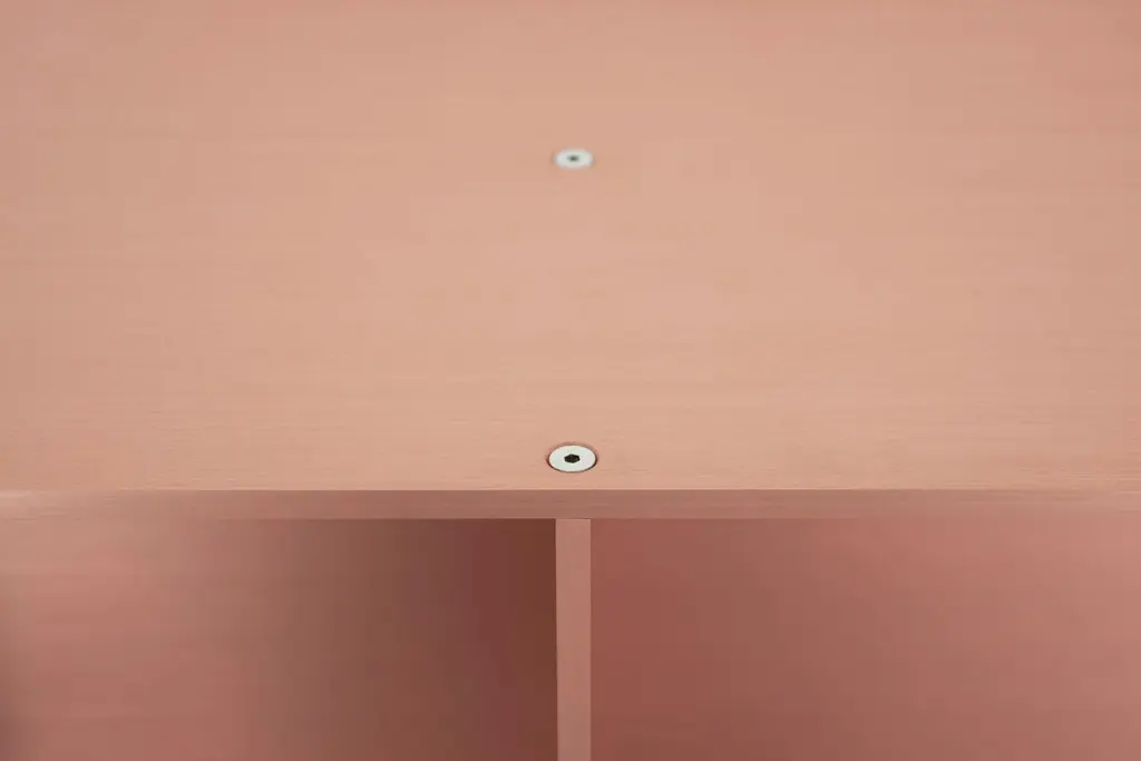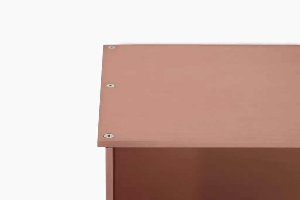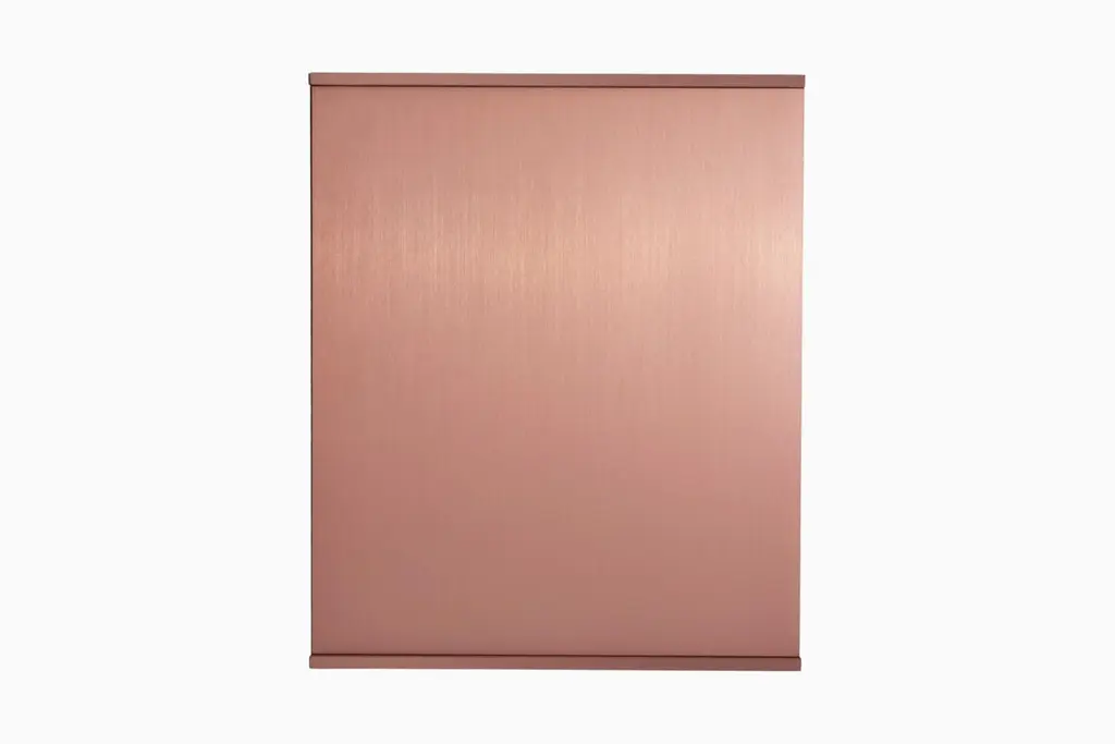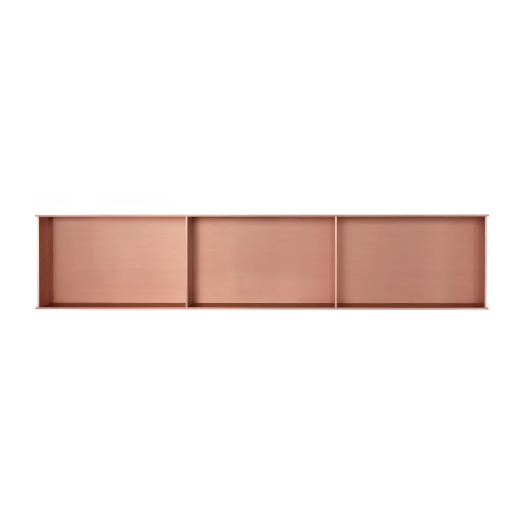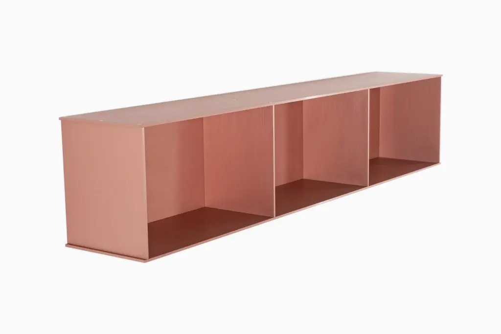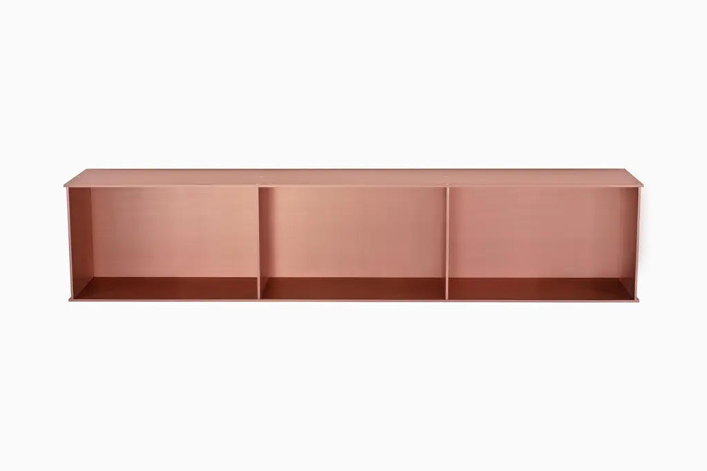 The Minimalist wall-mounted 3G shelf is sculpted out of 1/4 inch thick, brushed and anodized. Each shelf has an inset bolted U-channel that spans the length of the shelf and easily mounts on included custom-bent steel Z-clips. Each bay of this modernist shelf is proportioned to the golden ratio and can the scale can be customized to match these proportions. The shelf is customizable based on these proportions and can be in 2, 3, 4, 5, 6, 7 and 8 bays. Finish samples, available upon request. Shown in satin copper anodized finish.