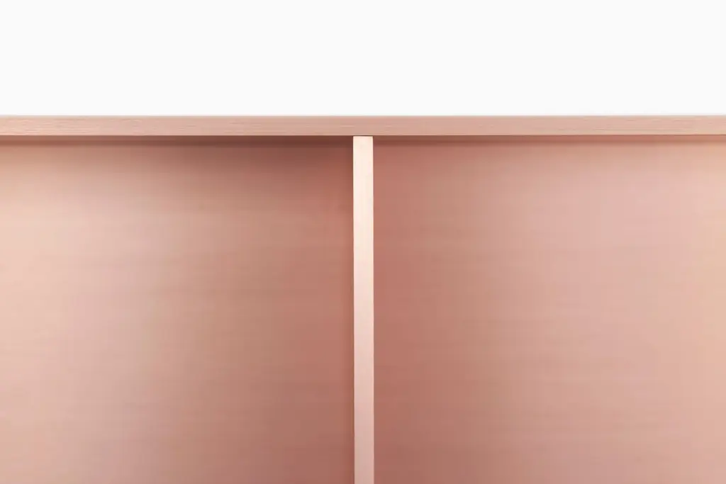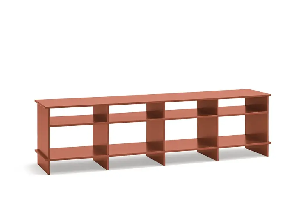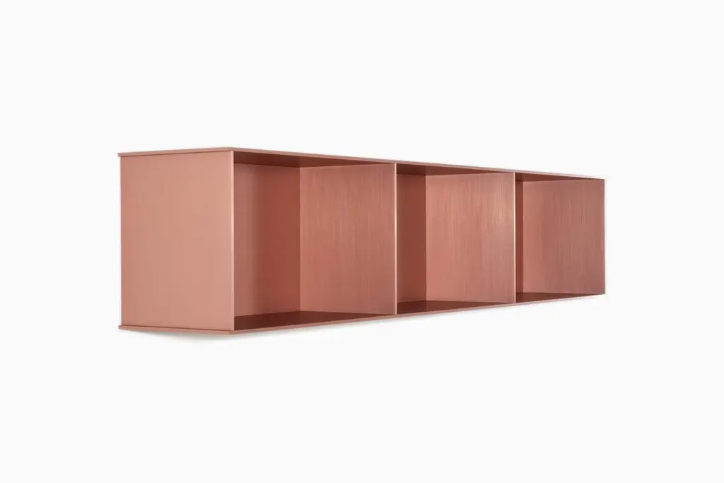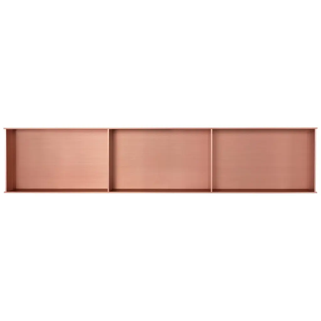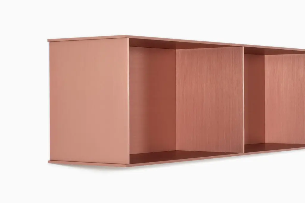 The Minimalist wall-mounted 3G shelf is sculpted out of 1/4 inch thick, brushed and anodized. Each shelf has an inset bolted U-channel that spans the length of the shelf and easily mounts on included custom-bent steel Z-clips. Each bay of this modernist shelf is proportioned to the golden ratio and can the scale can be customized to match these proportions. The shelf is customizable based on these proportions and can be in 2, 3, 4, 5, 6, 7 and 8 bays. Finish samples, available upon request. Shown in satin copper anodized finish.