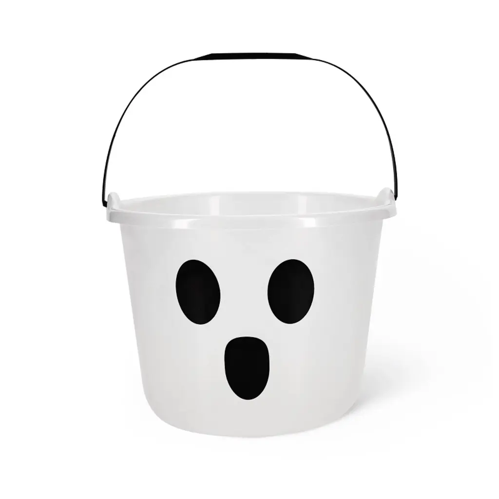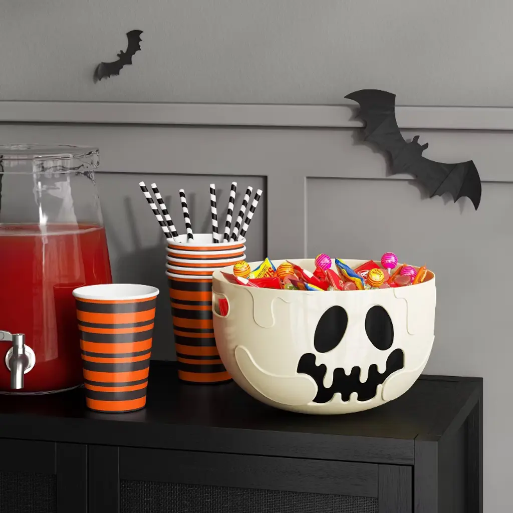 Serve candy to trick-or-treaters in style with this Round Shaped Ghost Candy Serving Bowl from Hyde and EEK! Boutique™. Made from BPA-free plastic, this candy serving bowl in white features a ghost face for classic Halloween vibes. This 3-liter bowl is designed in a round shape and features cutout handles for easy carrying.Hyde and EEK! Boutique™: Thrilling delights. Curious oddities.