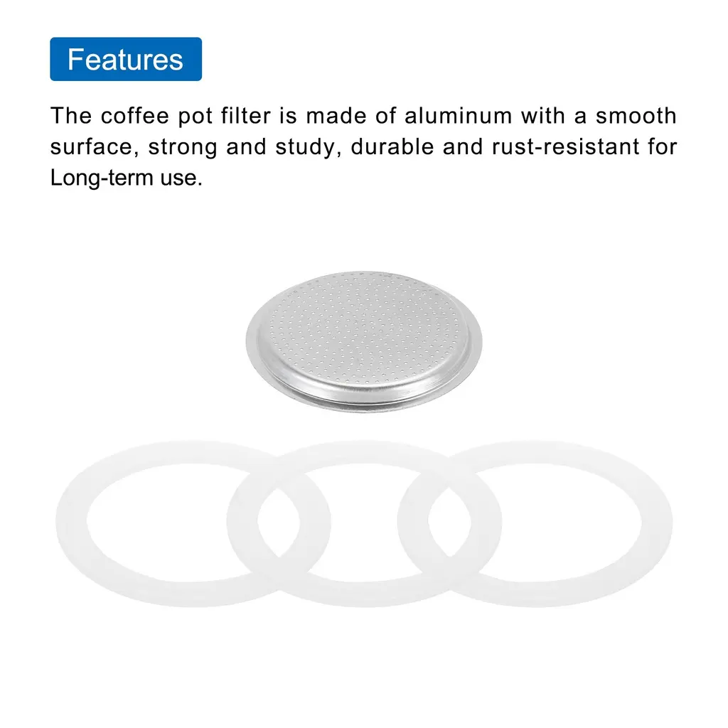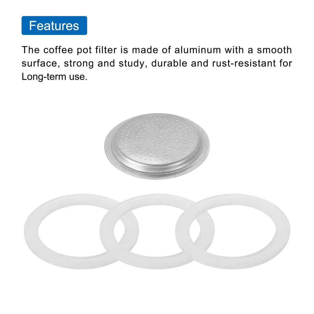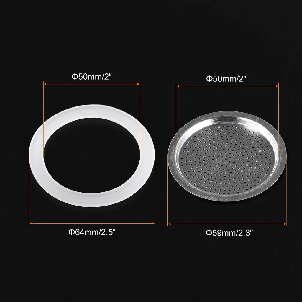 Silicone gaskets and stainless steel filter are critical accessories for coffee maker for mocha pot coffee, the gasket prevents side leakage of water or coffee.Package Content: 3 x Silicone Gasket; 1 x Stainless Steel FilterThe gasket are made of soft and flexible silicone material, good sealing, not easy to deform, crack or leak. Smooth surface metal filter, durable and sturdy.Remove the old seal gasket ring and replace it with the new one you received, and the filter is easy to install and remove.Please check your gasket and filter of the coffee maker and measure the size before ordering.What is this?Silicone gaskets and stainless steel filter are critical accessories for coffee maker for mocha pot coffee, the gasket prevents side leakage of water or coffee.What will I get?Package Content:3 x Silicone Gasket1 x Stainless Steel FilterColor: White, Silver ToneMaterial: Silicone, Stainless SteelType: Fit for 3-cup mocha coffee potGasket Size: 50x64mm/2x2.5inch(IDxOD)Filter outer diameter: 59mm/2.3inchFilter mounting hole diameter: 50mm/2inchAre there any advantages of the product?The gasket are made of soft and flexible silicone material, good sealing, not easy to deform, crack or leak. Smooth surface metal filter, durable and sturdy.How to use it?Remove the old seal gasket ring and replace it with the new one you received, and the filter is easy to install and remove.What should I notice?Please check your gasket and filter of the coffee maker and measure the size before ordering.