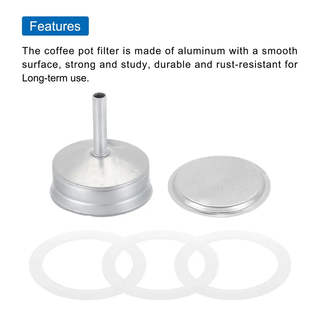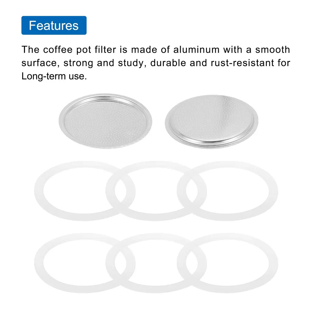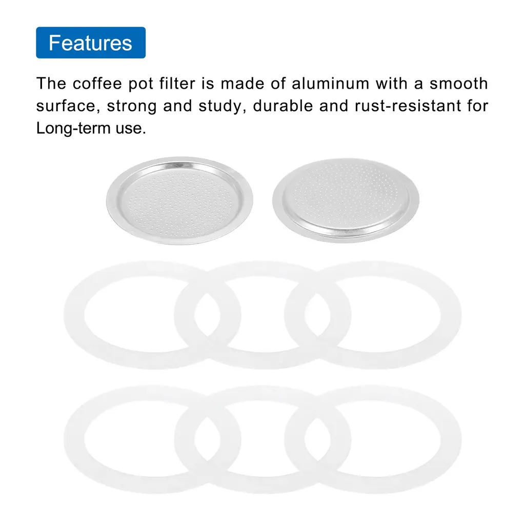 Silicone gaskets and stainless steel filter are critical accessories for coffee maker for mocha pot coffee, the gasket prevents side leakage of water or coffee.Package Content: 3 x Silicone Gasket; 1 x Stainless Steel FilterThe gasket are made of soft and flexible silicone material, good sealing, not easy to deform, crack or leak. Smooth surface metal filter, durable and sturdy.Remove the old seal gasket ring and replace it with the new one you received, and the filter is easy to install and remove.Please check your gasket and filter of the coffee maker and measure the size before ordering.What is this?Silicone gaskets and stainless steel filter are critical accessories for coffee maker for mocha pot coffee, the gasket prevents side leakage of water or coffee.What will I get?Package Content:3 x Silicone Gasket1 x Stainless Steel FilterColor: White, Silver ToneMaterial: Silicone, Stainless SteelType: Fit for 3-cup mocha coffee potGasket Size: 50x64mm/2x2.5inch(IDxOD)Filter outer diameter: 59mm/2.3inchFilter mounting hole diameter: 50mm/2inchAre there any advantages of the product?The gasket are made of soft and flexible silicone material, good sealing, not easy to deform, crack or leak. Smooth surface metal filter, durable and sturdy.How to use it?Remove the old seal gasket ring and replace it with the new one you received, and the filter is easy to install and remove.What should I notice?Please check your gasket and filter of the coffee maker and measure the size before ordering.