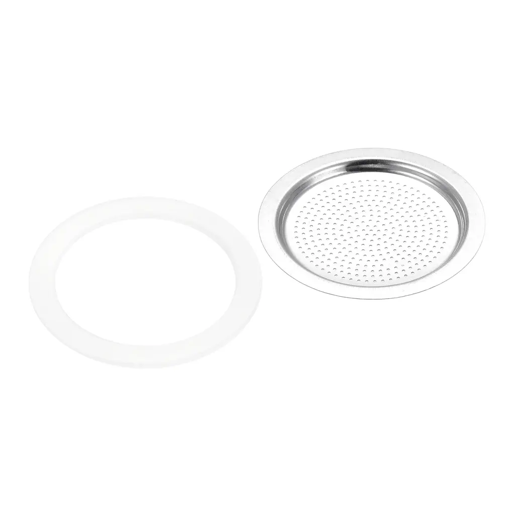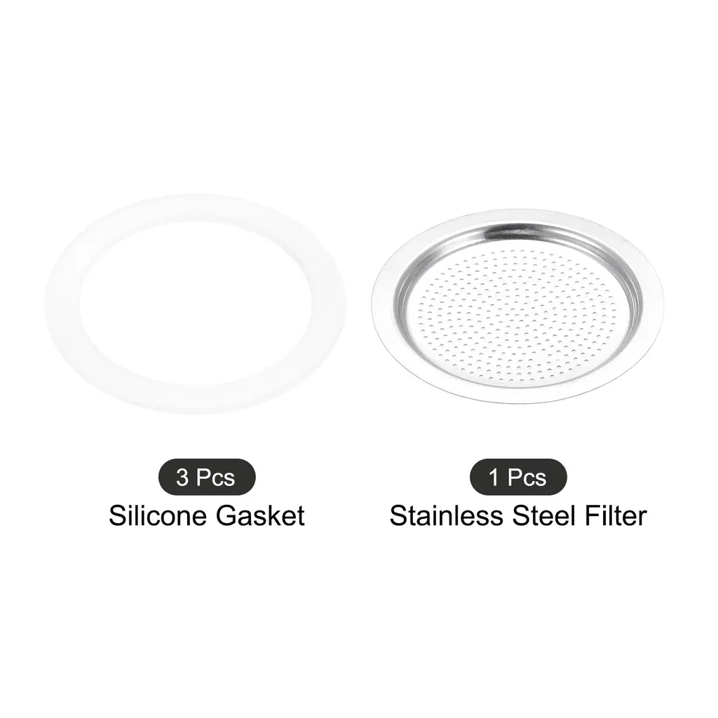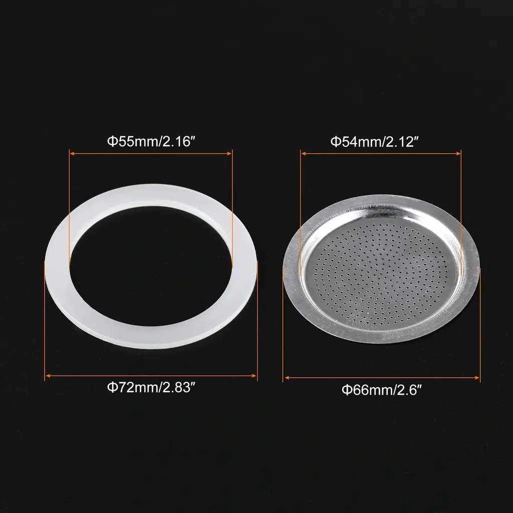 Silicone gaskets and stainless steel filter are critical accessories for coffee maker for mocha pot coffee, the gasket prevents side leakage of water or coffee.Package Content: 3 x Silicone Gasket; 1 x Stainless Steel FilterThe gasket are made of soft and flexible silicone material, good sealing, not easy to deform, crack or leak. Smooth surface metal filter, durable and sturdy.Remove the old seal gasket ring and replace it with the new one you received, and the filter is easy to install and remove.Please check your gasket and filter of the coffee maker and measure the size before ordering.What is this?Silicone gaskets and stainless steel filter are critical accessories for coffee maker for mocha pot coffee, the gasket prevents side leakage of water or coffee.What will I get?Package Content:3 x Silicone Gasket1 x Stainless Steel FilterColor: White, Silver ToneMaterial: Silicone, Stainless SteelType: Fit for 6-cup mocha coffee potGasket Size: 55x72mm/2.16x2.83inch(IDxOD)Filter outer diameter: 66mm/2.6inchFilter mounting hole diameter: 54mm/2.12inchAre there any advantages of the product?The gasket are made of soft and flexible silicone material, good sealing, not easy to deform, crack or leak. Smooth surface metal filter, durable and sturdy.How to use it?Remove the old seal gasket ring and replace it with the new one you received, and the filter is easy to install and remove.What should I notice?Please check your gasket and filter of the coffee maker and measure the size before ordering.