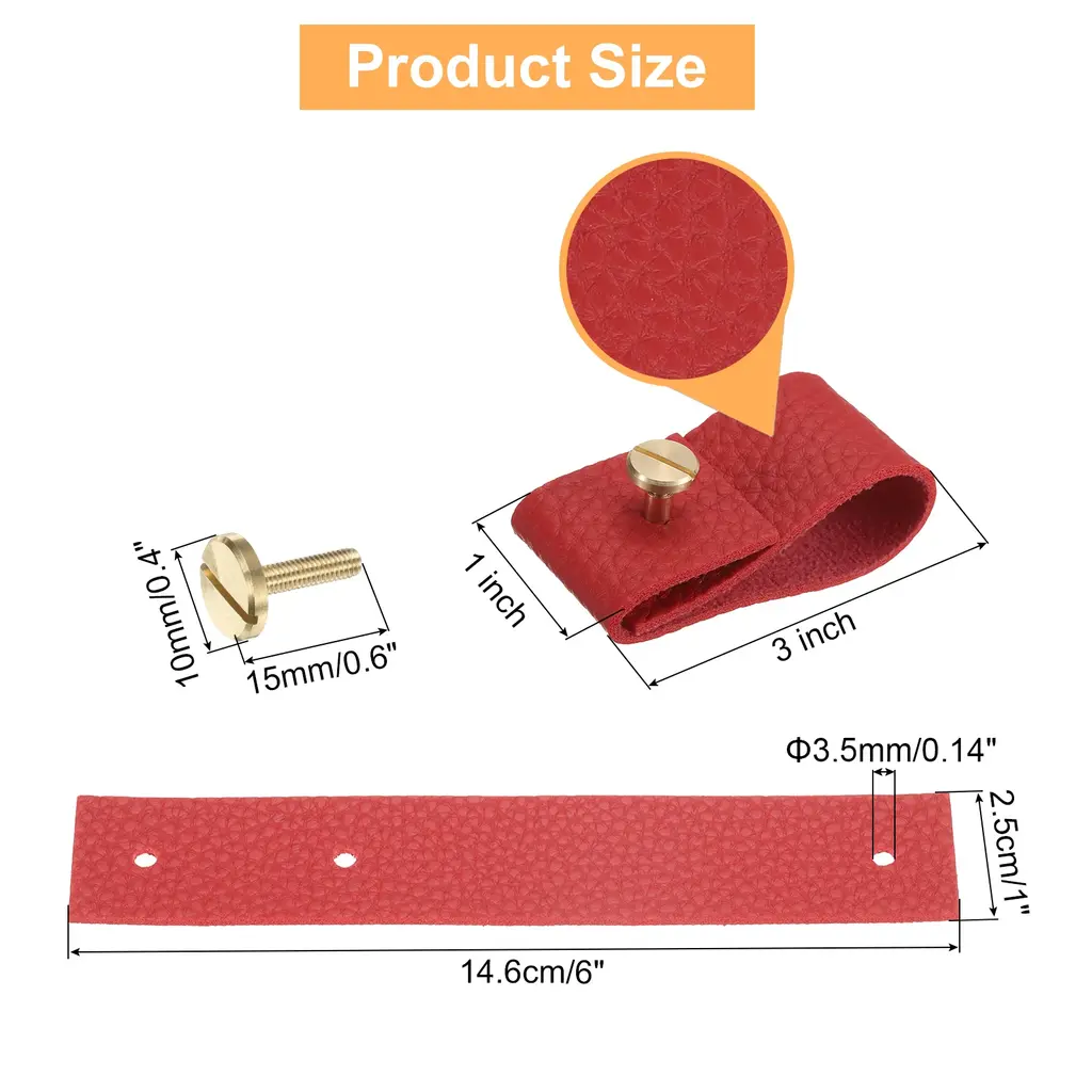 Description:1. The drawer pulls are made of soft and comfortable leather, ensuring durability and a long service life. The leather material adds a touch of elegance and sophistication to your furniture.2. These leather drawer pulls offer a comfortable grip and smooth operation when opening and closing drawers. They provide a sleek and modern replacement for traditional knobs, enhancing the overall aesthetic appeal of your furniture.3. To install these leather drawer pulls, simply mount them on the desired furniture surface using the provided screws, and the installation process is quick and hassle-free.4. These drawer pulls can be used in various settings, including bedrooms, living rooms, kitchens, and office spaces. They are versatile and suitable for different styles of cupboards, wardrobes, wine closets, lockers, shoe cupboards, and bookcases, adding a stylish touch wherever they are used.5. Please avoid excessive force or pulling on the drawer pulls, as this may cause damage over time.Specification:Material: LeatherColor: BlackSize: 14.6 x 2.5 cm/6 x 1 inch(L*W)Screw Size: 15 x 10 mm/0.6 x 0.4 inch(L*W)Leather Hole Diameter: 3.5 mm/0.14 inchPackage Included: 4pcs x leather drawer pull, 4pcs screw, 4pcs x button