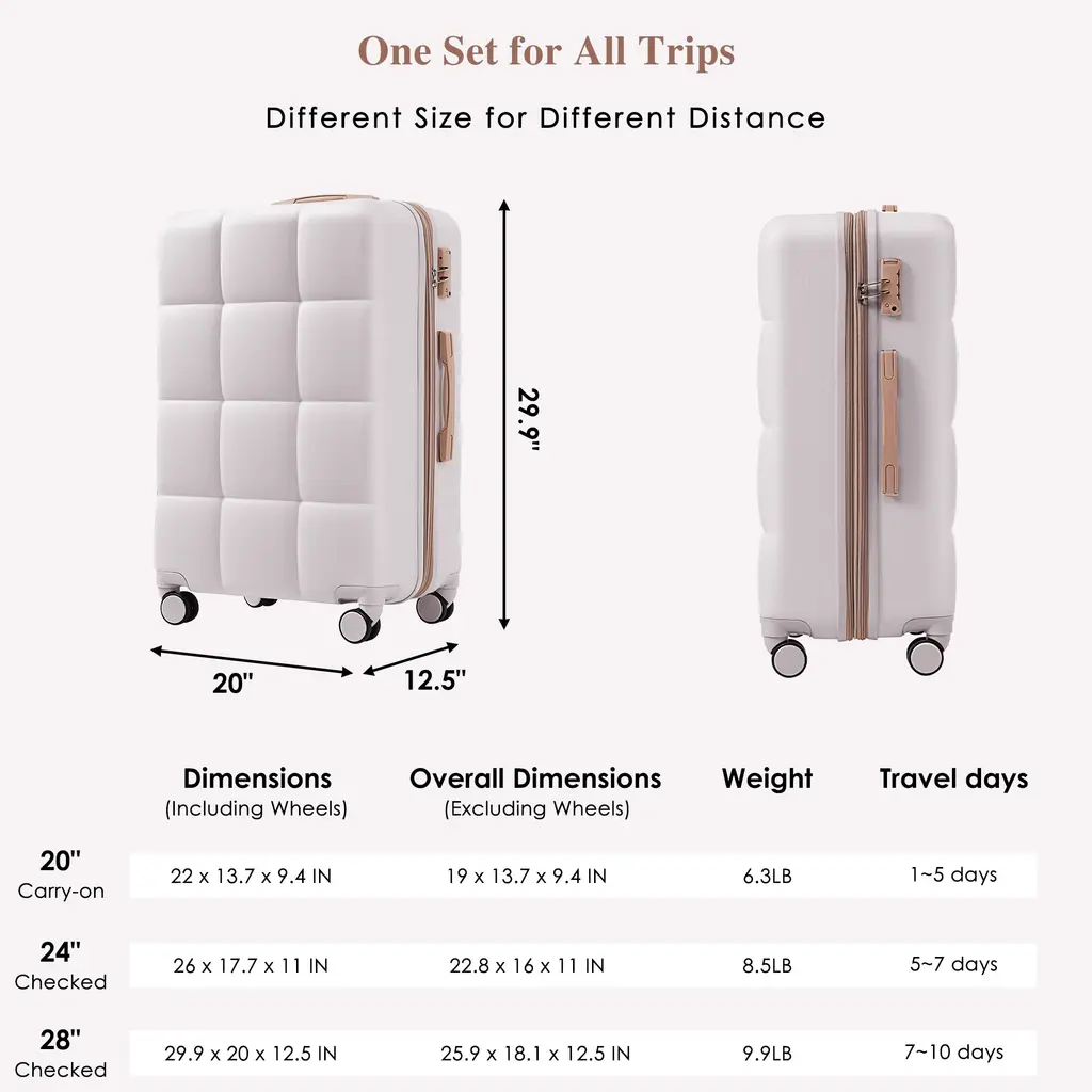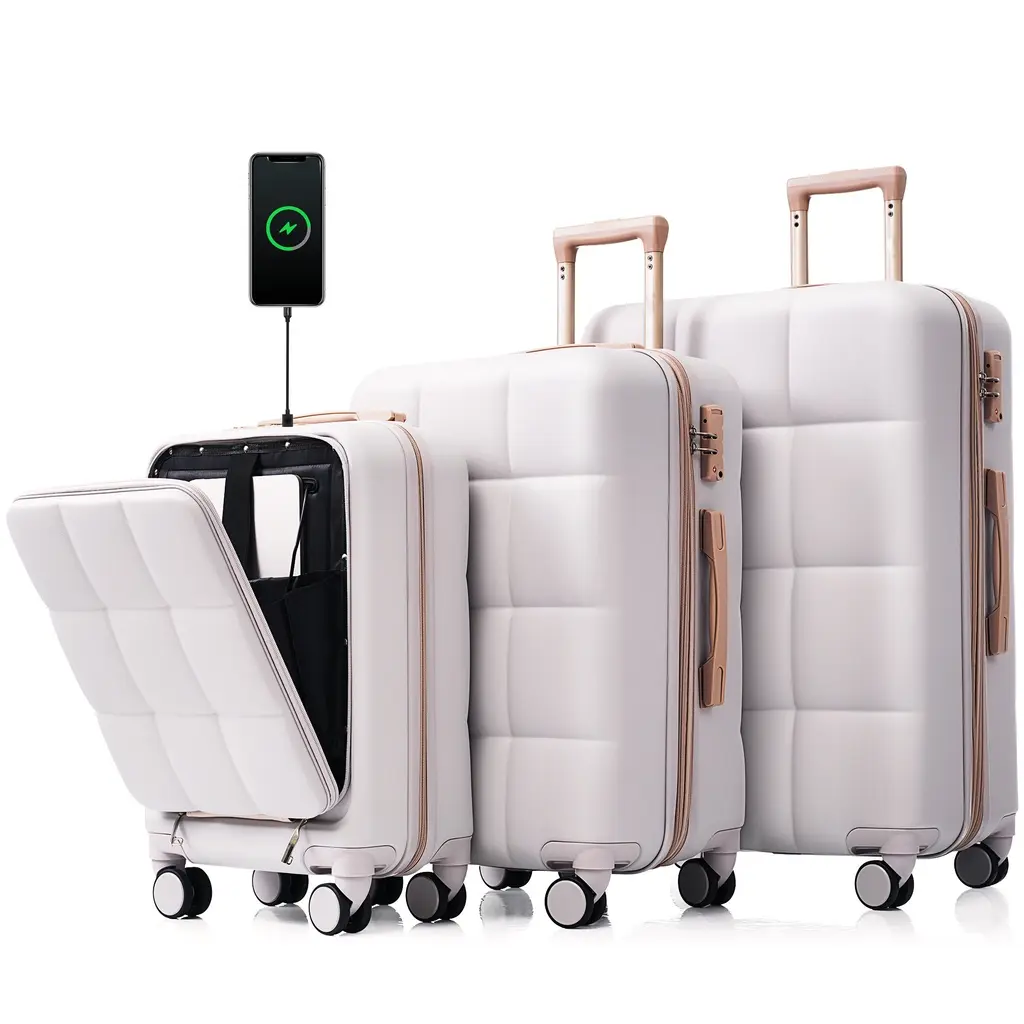 Elevate your travel experience with this premium 3-piece luggage set made from durable ABS material, featuring a scratch-resistant finish, smooth 360° spinner wheels, and an ergonomic retractable handle. Includes a carry-on with USB charging port, expandable checked suitcases, side hooks, integrated cup holder, and a convenient water-repellent weekender bag.Features:Quick Glance Points: