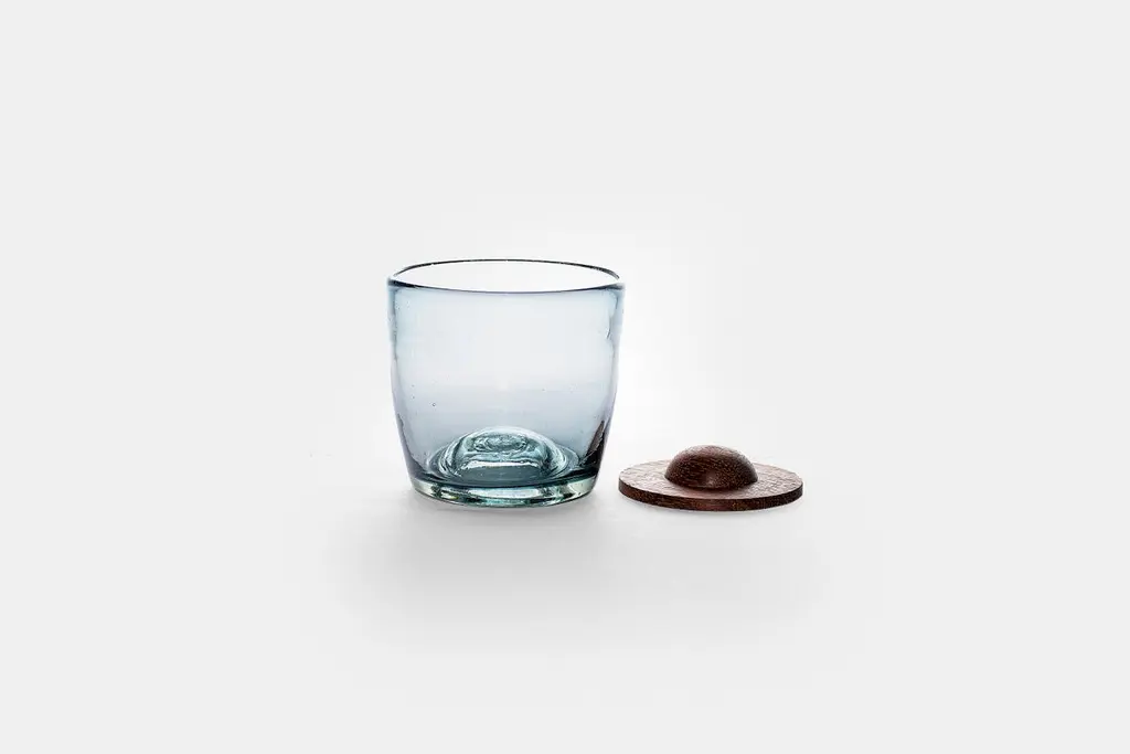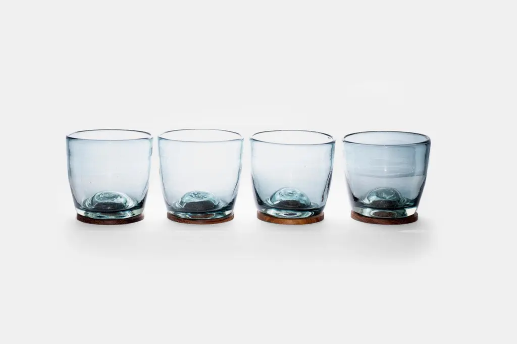 The liquid character of the molten glass bubble is the inspiration for the “Basico” glaseses. Its shape is molded and adapted to the half sphere of the practical wooden base on which the glass rests creating an aesthetic detail, characteristic concavity of the shape of each "Basico" glass.Our collection of glasses come in a 4-piece set of hand blown glass in colors such as gray, emerald green and transparent that will add warmth to your table with their individual parota wood cup holders.