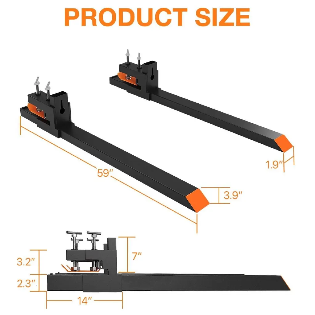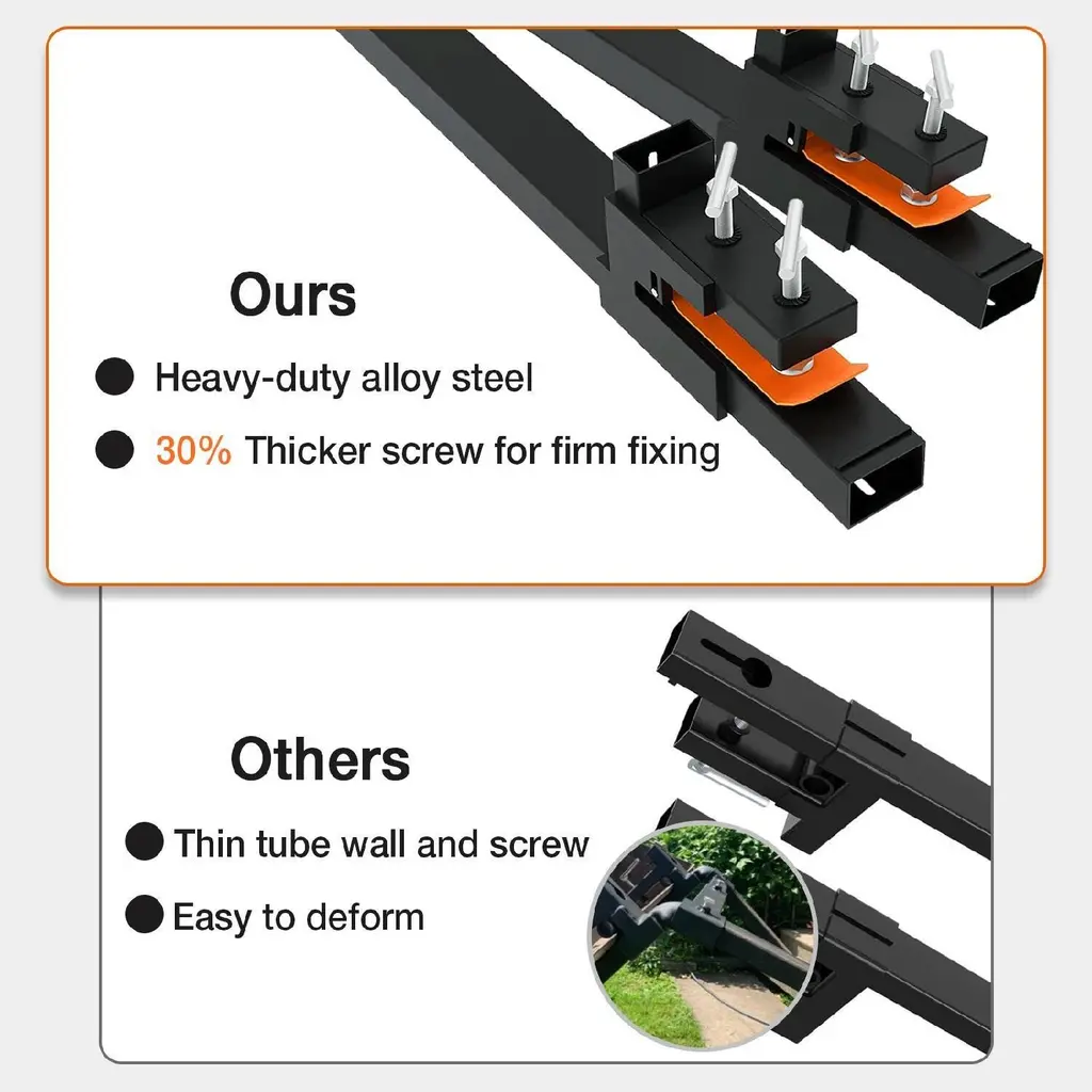 Durable and Longlasting Performance: Weighing a combined 98 LB and compatible with most loaders like John Deere and Kubota tractors, each fork blade is 60" long x 1.9" wide and provides a working length of 45"Secure Lifting: These medium duty pallet forks boast a 4000 LBS capacity, crafted from higher load-bearing capacity alloy steel tubing to tackle daily tasks without bending or crackingEnhanced Stability: With reinforced bolts and grooved screw heads, our clamp-on pallet fork maximizes contact area and stability for reliable useEasy to Install: Slide the fork over the bucket's cutting edge and clamp it down to lock. These pallet forks allow you to haul logs, lumber, and firewoodEasy Installation & Versatility: Effortlessly attach our tractor fork over your bucket's cutting edge for diverse tasks like moving logs, fence posts, clearing debris, and more, suitable for various loading and unloading applications