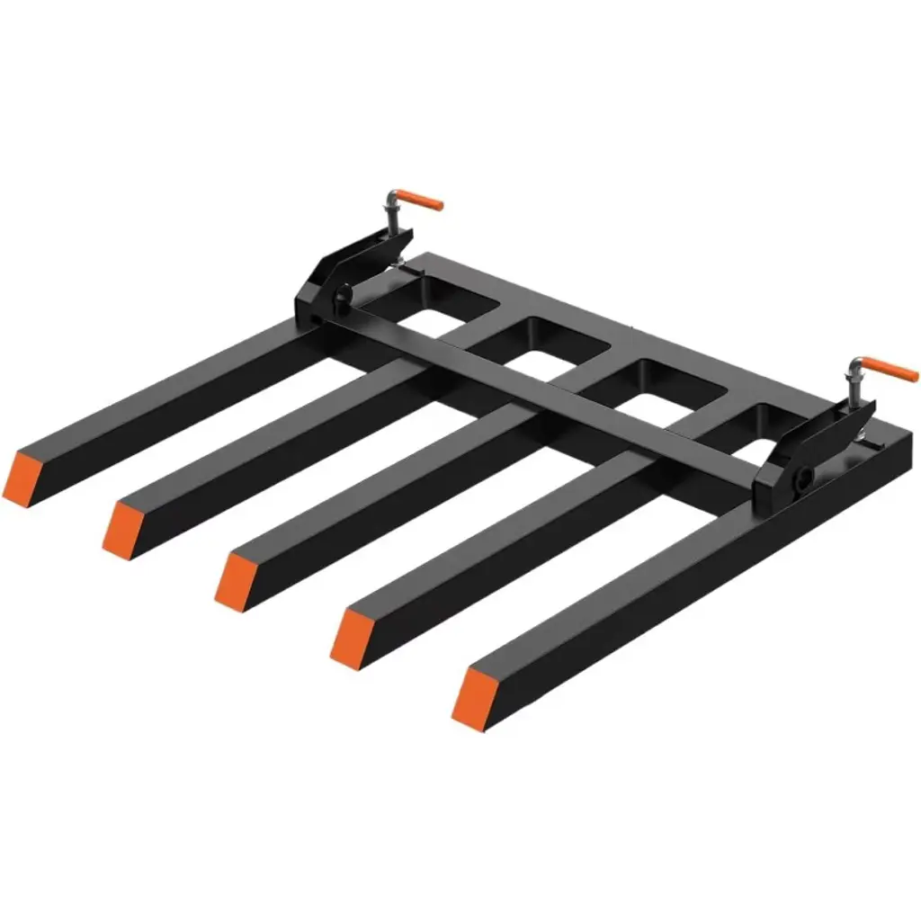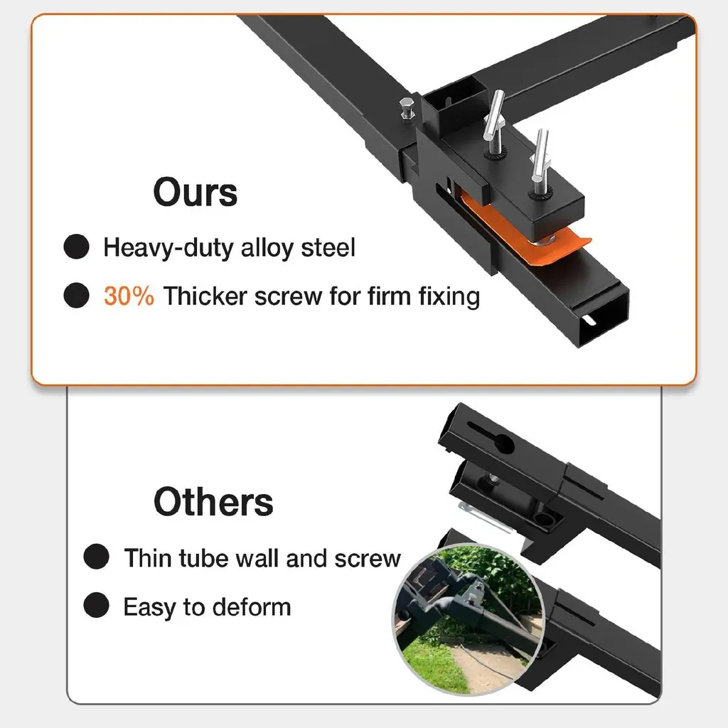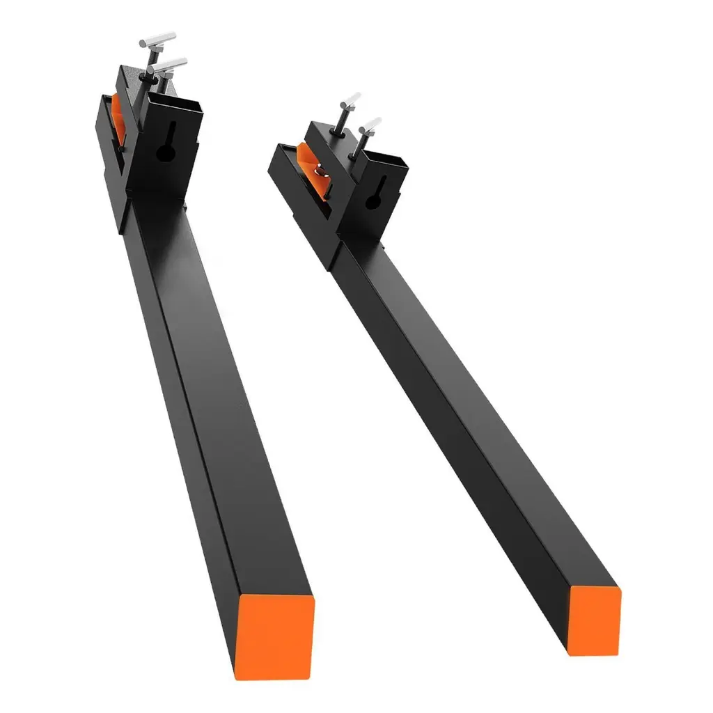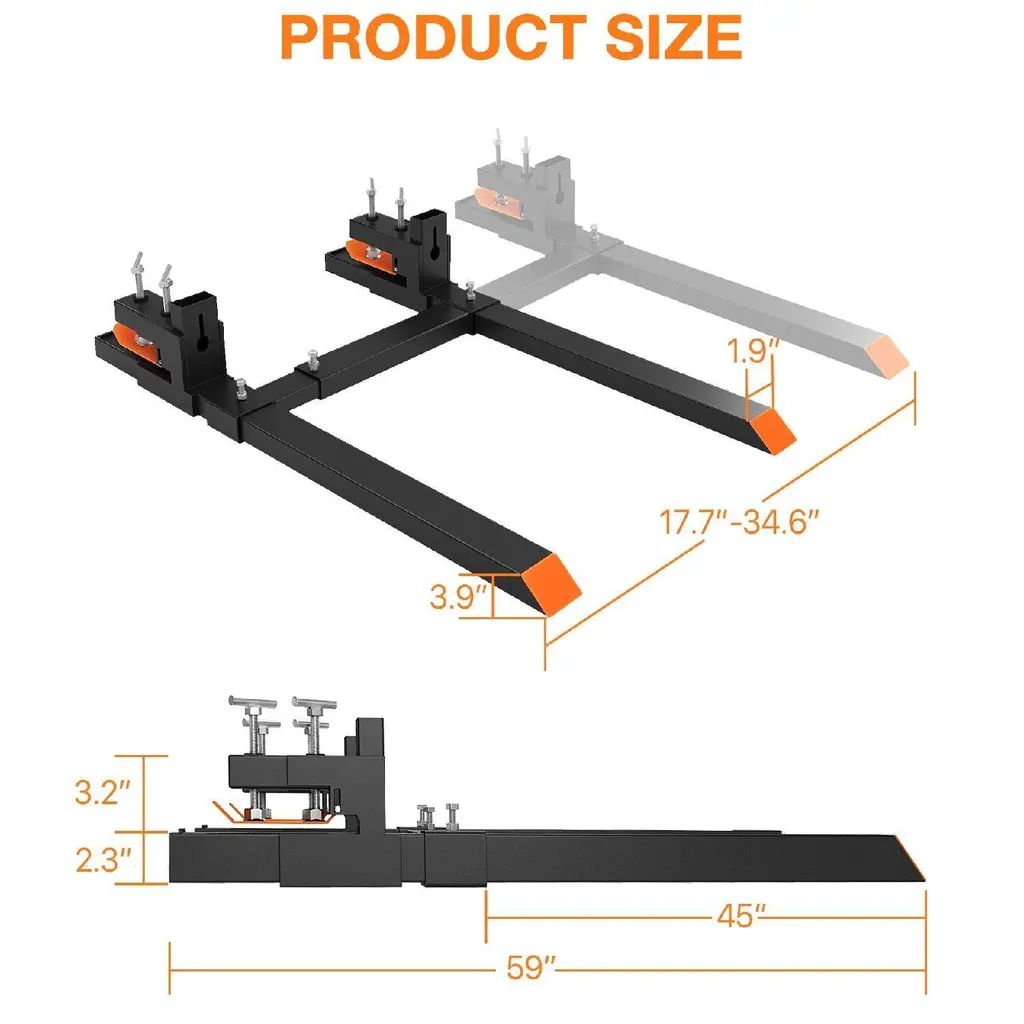Durable and Longlasting Performance: Weighing a combined 98 LB and compatible with most loaders like John Deere and Kubota tractors, each fork blade is 60" long x 1.9" wide and provides a working length of 45"Secure Lifting: These medium duty pallet forks boast a 4000 LBS capacity, crafted from higher load-bearing capacity alloy steel tubing to tackle daily tasks without bending or crackingEnhanced Stability: With reinforced bolts and grooved screw heads, our clamp-on pallet fork maximizes contact area and stability for reliable useEasy to Install: Slide the fork over the bucket's cutting edge and clamp it down to lock. These pallet forks allow you to haul logs, lumber, and firewoodEasy Installation & Versatility: Effortlessly attach our tractor fork over your bucket's cutting edge for diverse tasks like moving logs, fence posts, clearing debris, and more, suitable for various loading and unloading applications