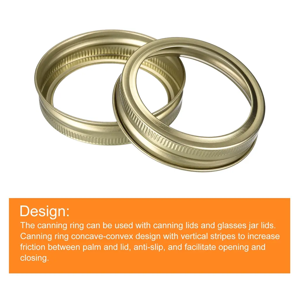 Features:Good Material: The mason jar bands are made of tinplate, which can improve the sealing of the lid, keep food fresh longer, not easy to leak, and prevent bad odors.Vertical Pattern: The canning ring can be used with canning lids and glasses jar lids. Canning ring concave-convex design with vertical stripes to increase friction between palm and lid, anti-slip, and facilitate opening and closing.Easy to Clean: The canning rings are without rusting or warping like regular canning jar lids and they have no problem using the dishwasher to clean. It can be used in the refrigerator for refrigeration.Scope of Application: A good gift for a friend who love jars for storing and cooking in the kitchen. Suitable for the freezer and refrigerator as well as dry storage, such as soup, yogurt, sports drinks, cereal, candy, etc.Specification:Outer Diameter: 73mm / 2.87”Suitable Diameter: 70mm / 2.76”Thickness: 16mm / 0.63”Material: TinplateColor: GoldPackage Content:48 x Canning Jar Rings