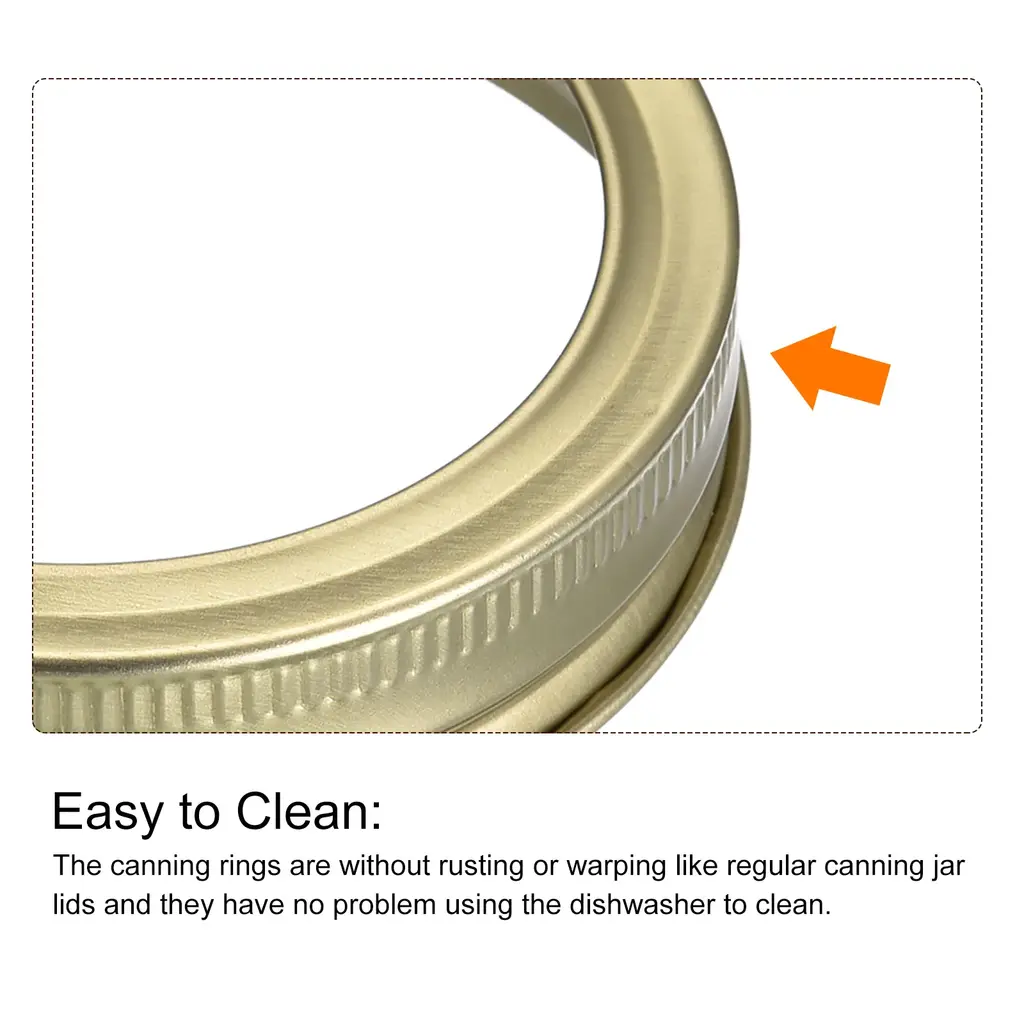 Features:Good Material: The mason jar bands are made of tinplate, which can improve the sealing of the lid, keep food fresh longer, not easy to leak, and prevent bad odors.Vertical Pattern: The canning ring can be used with canning lids and glasses jar lids. Canning ring concave-convex design with vertical stripes to increase friction between palm and lid, anti-slip, and facilitate opening and closing.Easy to Clean: The canning rings are without rusting or warping like regular canning jar lids and they have no problem using the dishwasher to clean. It can be used in the refrigerator for refrigeration.Scope of Application: A good gift for a friend who love jars for storing and cooking in the kitchen. Suitable for the freezer and refrigerator as well as dry storage, such as soup, yogurt, sports drinks, cereal, candy, etc.Specification:Outer Diameter: 73mm / 2.87”Suitable Diameter: 70mm / 2.76”Thickness: 16mm / 0.63”Material: TinplateColor: GoldPackage Content:48 x Canning Jar Rings