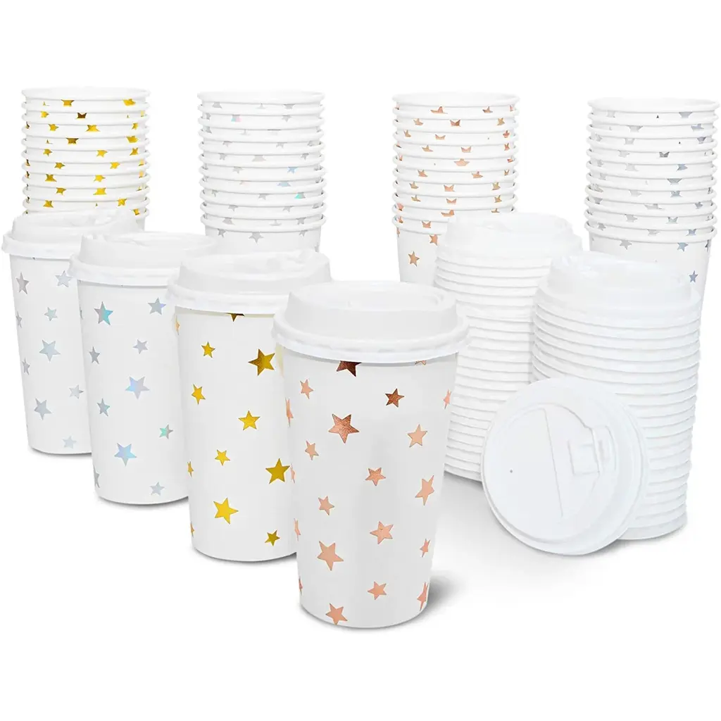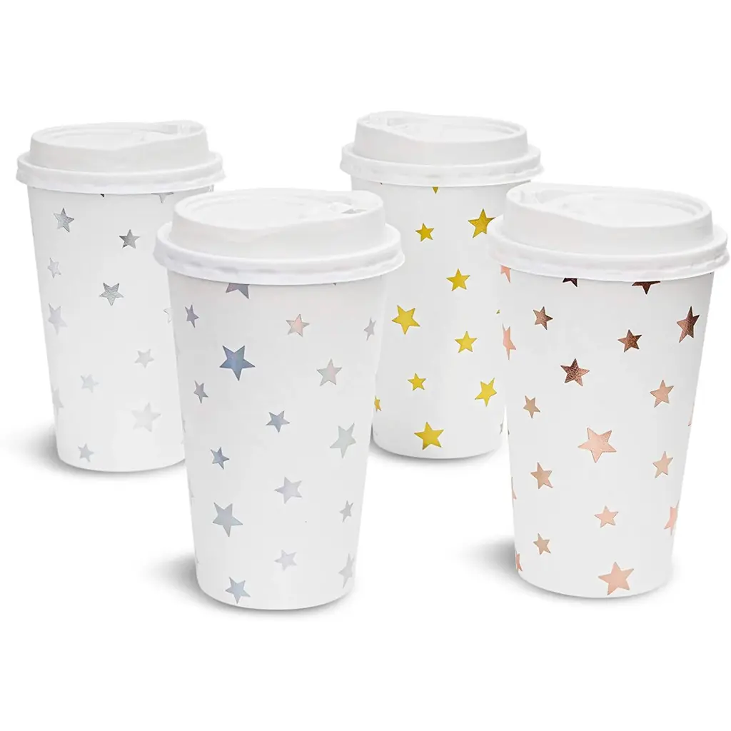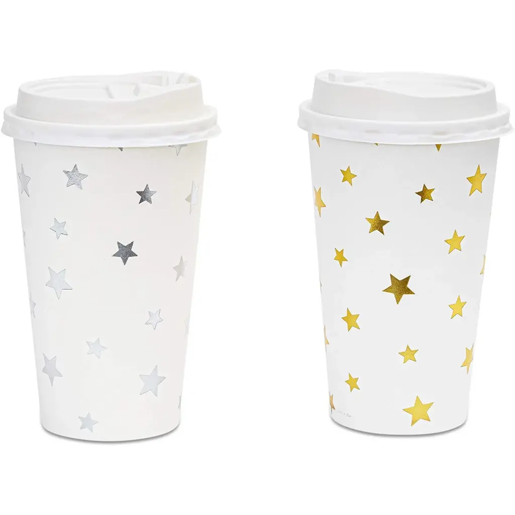 48x Cute Insulated Disposable Paper Coffee Cups With Lids Foil Stars Design 16oz - White