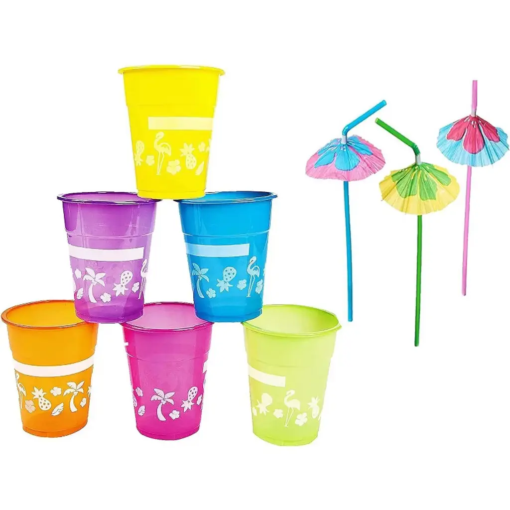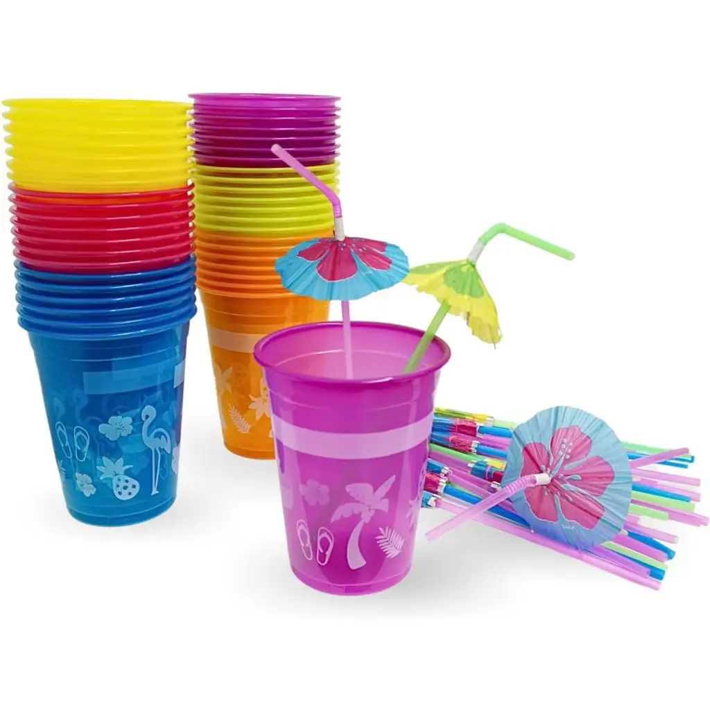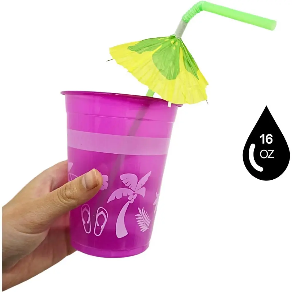 4E's Novelty 48 Pack Tropical Disposable Plastic Party Cups 16oz With Parasol Straws – Hawaiian Luau Beach Party And Pool Parties, Theme Birthday