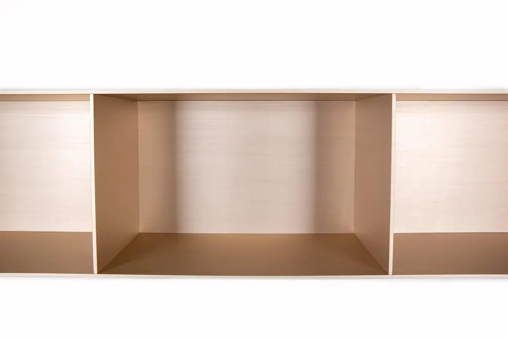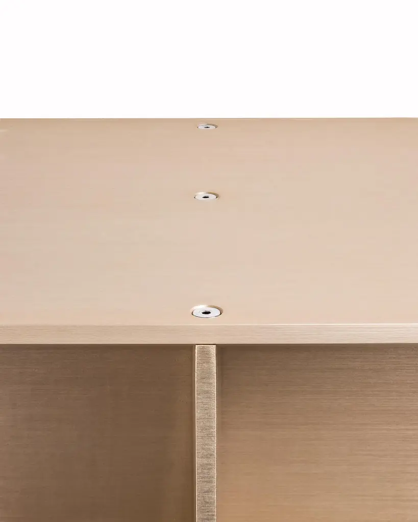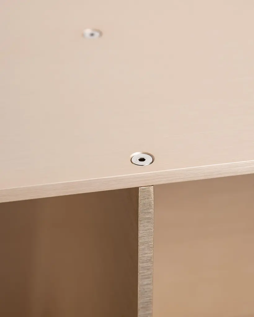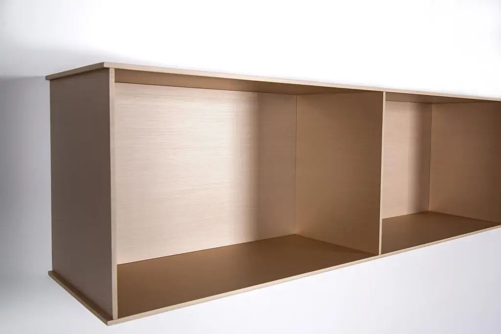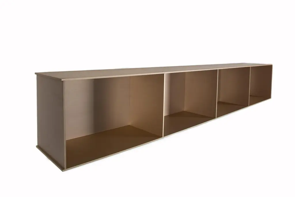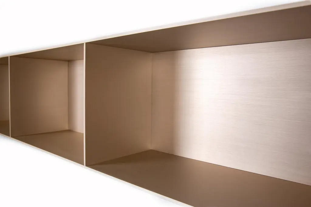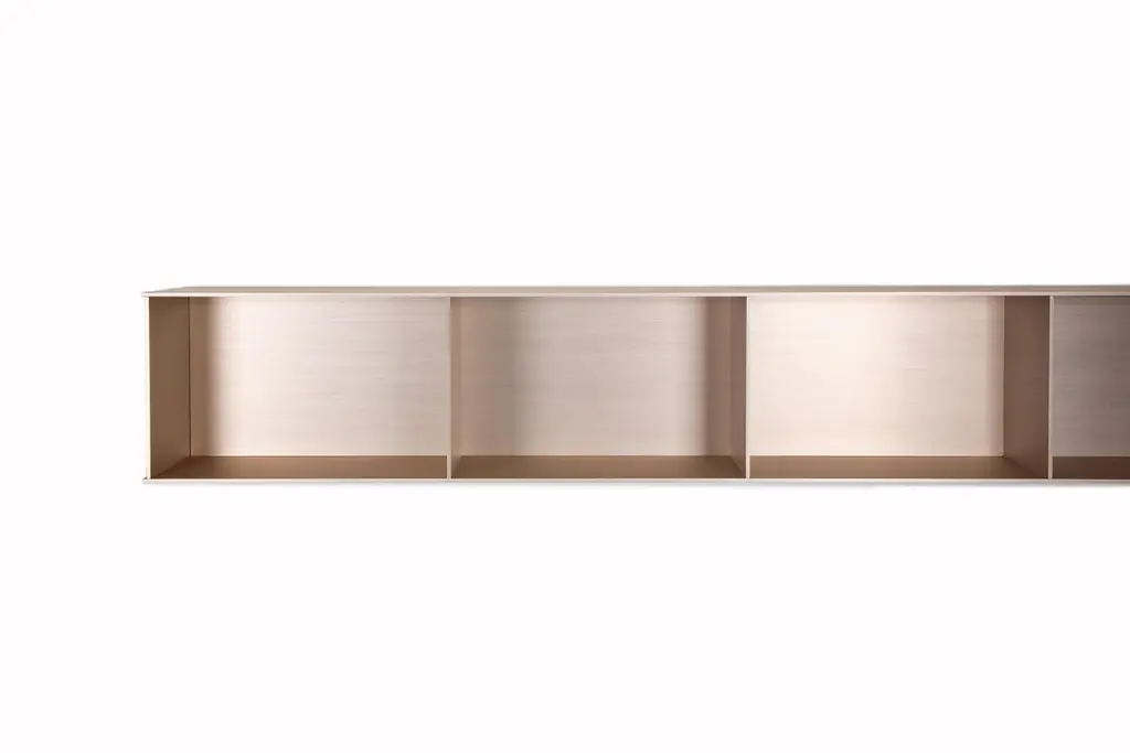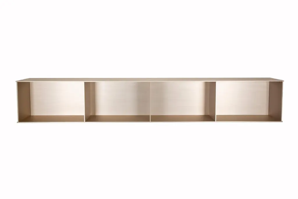 The Minimalist wall-mounted 4G shelf is sculpted out of 1/4 inch thick, brushed and anodized. Each shelf has an inset bolted U-channel that spans the length of the shelf and easily mounts on included custom-bent steel Z-clips. Each bay of this modernist shelf is proportioned to the golden ratio and can the scale can be customized to match these proportions. The shelf is customizable based on these proportions and can be in 2, 3, 4, 5, 6, 7 and 8 bays. Finish samples, available upon request. Shown in satin almond anodized finish.