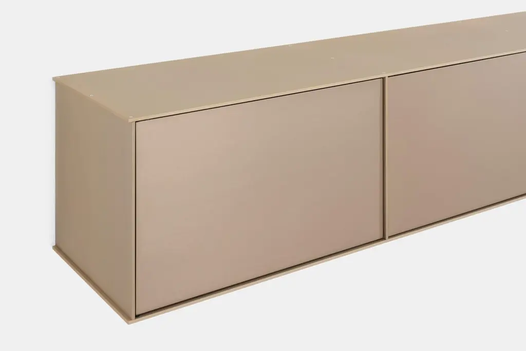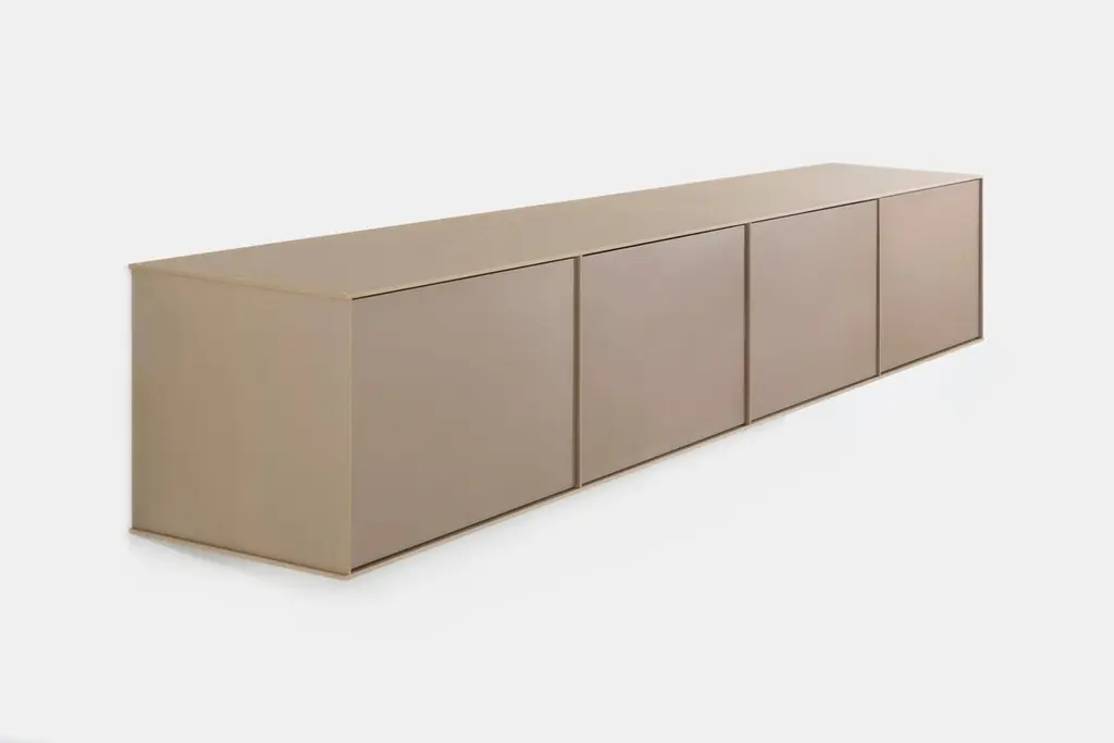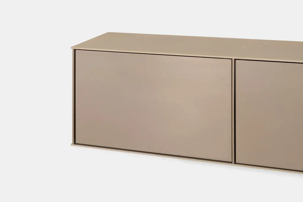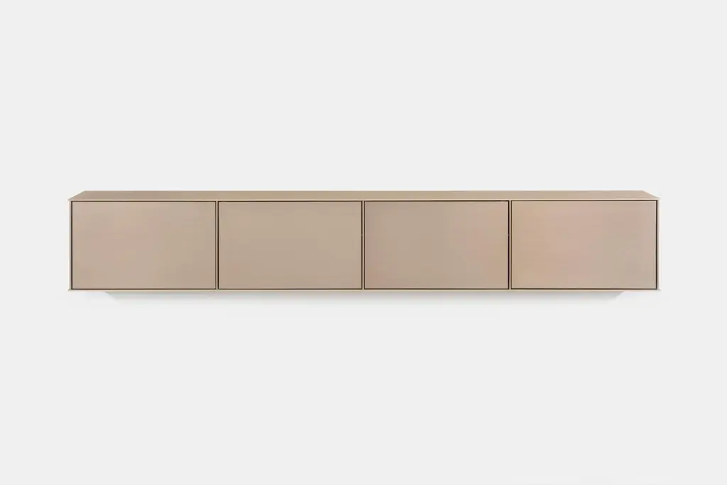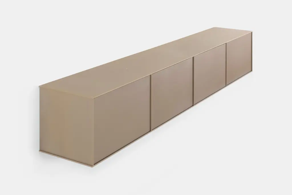 The minimalist wall-mounted 4G shelf is sculpted out of 1/4 inch thick, brushed and anodized. The shelf has an inset bolted U-channel that spans the length of the shelf and easily mounts on included custom-bent steel Z-clips. Each bay of this modernist shelf is proportioned to the golden ratio and can the scale can be customized to match these proportions. The shelf is customizable based on these proportions and can be in 2, 3, 4, 5, 6, 7 and 8 bays. Finish samples, available upon request. Shown in the satin almond anodized finish with doors and removable shelves.