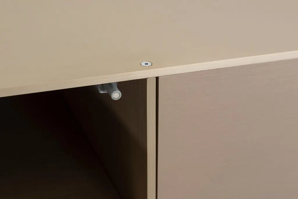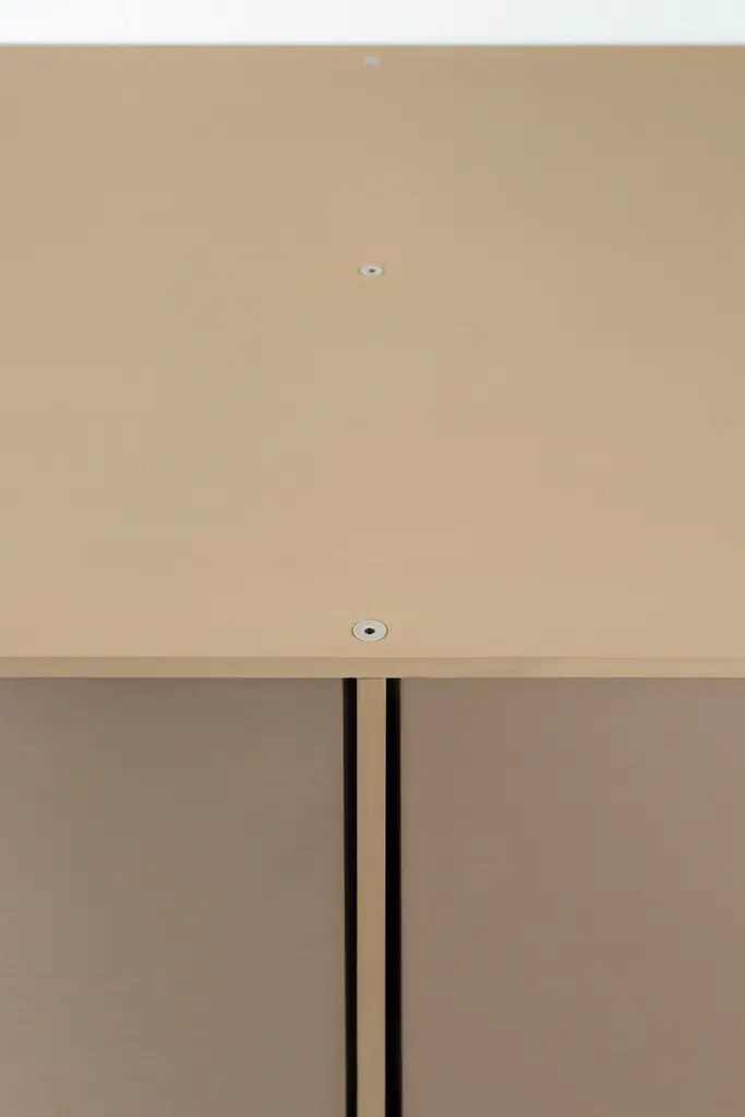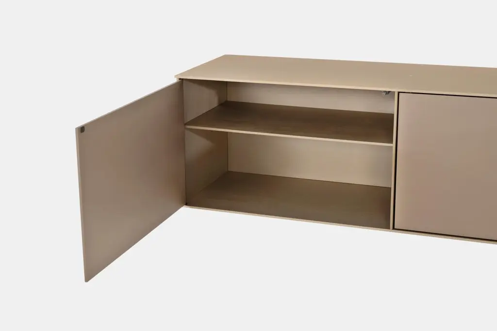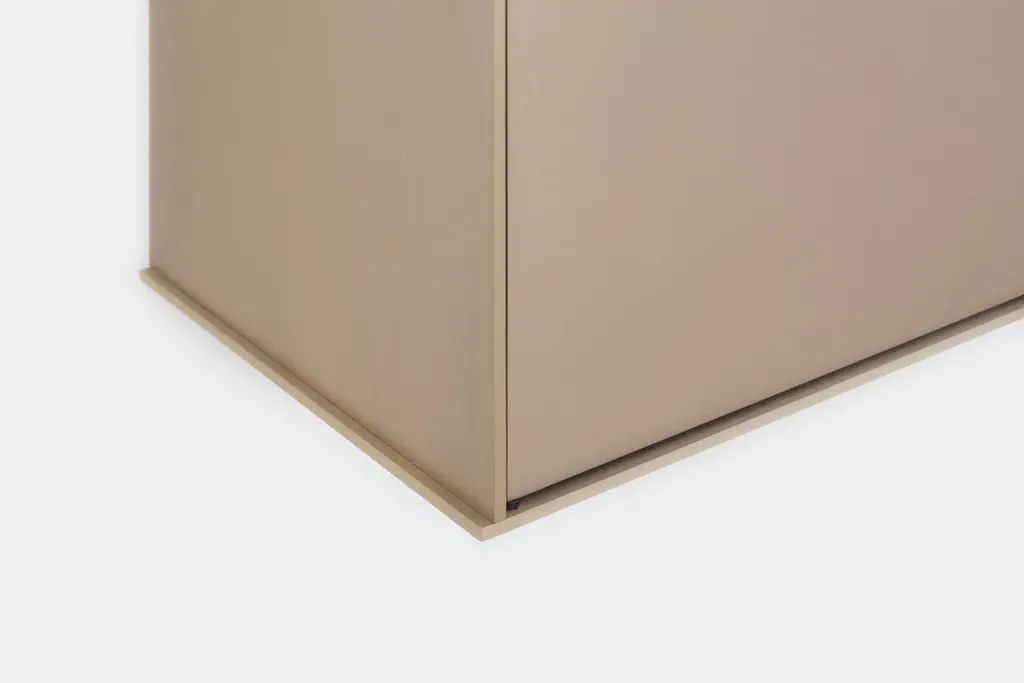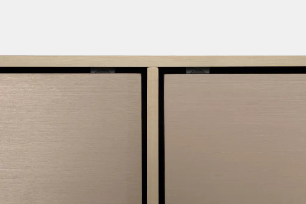 The minimalist wall-mounted 4G shelf is sculpted out of 1/4 inch thick, brushed and anodized. The shelf has an inset bolted U-channel that spans the length of the shelf and easily mounts on included custom-bent steel Z-clips. Each bay of this modernist shelf is proportioned to the golden ratio and can the scale can be customized to match these proportions. The shelf is customizable based on these proportions and can be in 2, 3, 4, 5, 6, 7 and 8 bays. Finish samples, available upon request. Shown in the satin almond anodized finish with doors and removable shelves.