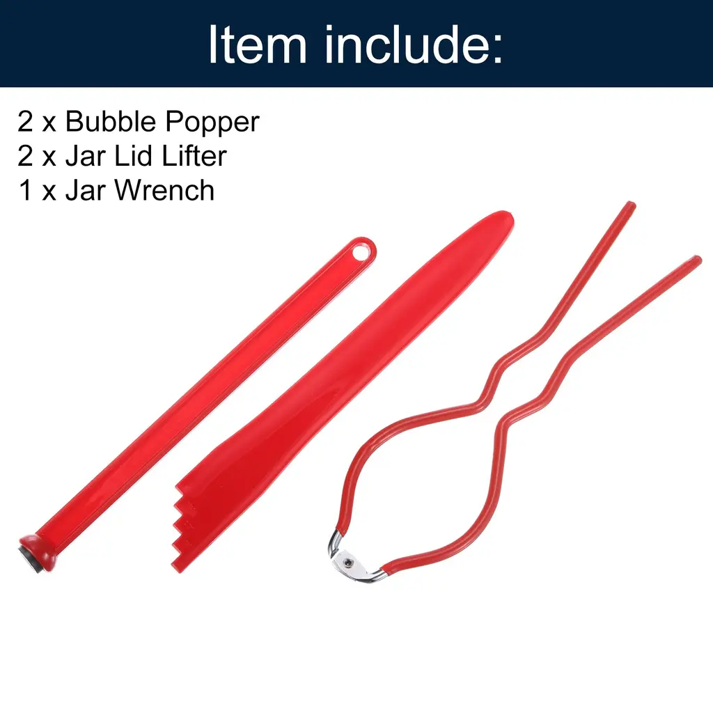 Description:Widely Used: These canning tool kits are versatile and suitable for use with various types of canning jars. From small glass jars to standard-sized and larger canning jars, they are suitable for families or restaurants.Material: Our canning lifter tongs are made of strong and sturdy metal with an electroplated coating for extra durability. The comfort-grip handles and smooth hinge make it non-slip and effortless to use.Easy to Use: The canning lifter tongs is safe and convenient to use. Its PP handles grip clamps securely onto the jar top, making it easy to lift any size canning jar out of boiling water while keeping your hands safe.Keep Your Item Clean: Cleaning is important when it comes to home canning. That's why the canning tool kits are so helpful - it keeps your tools clean so you don't have to touch your jars directly.Specification:Material: Metal + PlasticBubble Popper Size: 226 x 31 x 3mm/ 8.9" x 1.22" x 0.12" (L x W x H)Jar Lid Lifter Size: 175 x 17 x 16mm/ 6.89" x 0.67" x 0.63" (L x W x H)Jar Wrench Size: 276 x 83 x 8mm / 10.87'' x 3.27'' x 0.31'' (L x W x H)Color: RedPackage Content: 2x Bubble Popper, 2x Jar Lid Lifter, 1x Jar Wrench