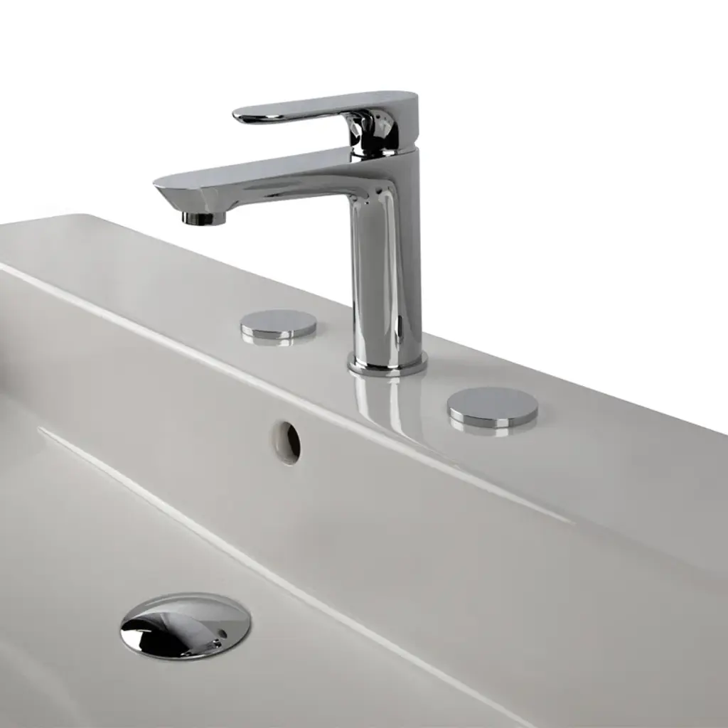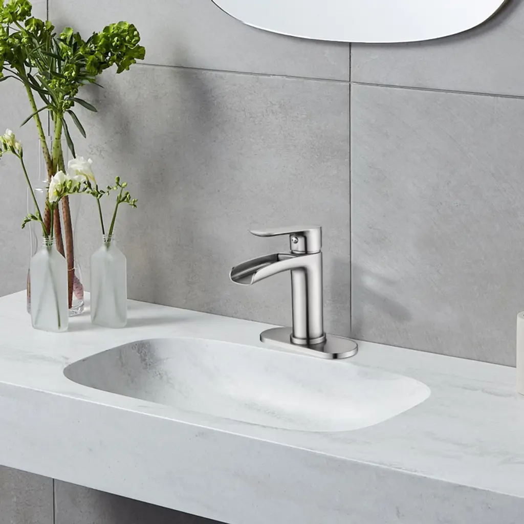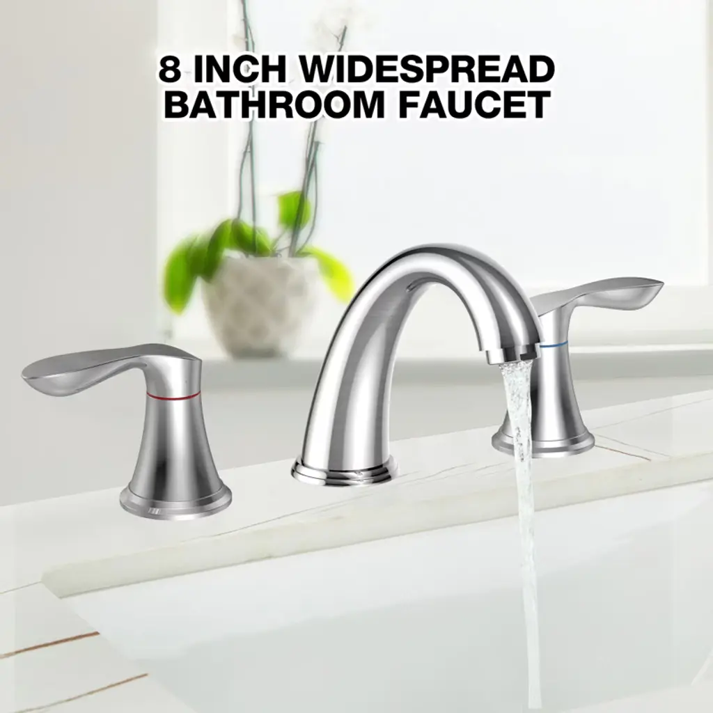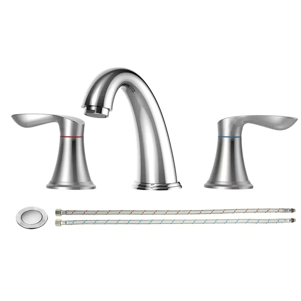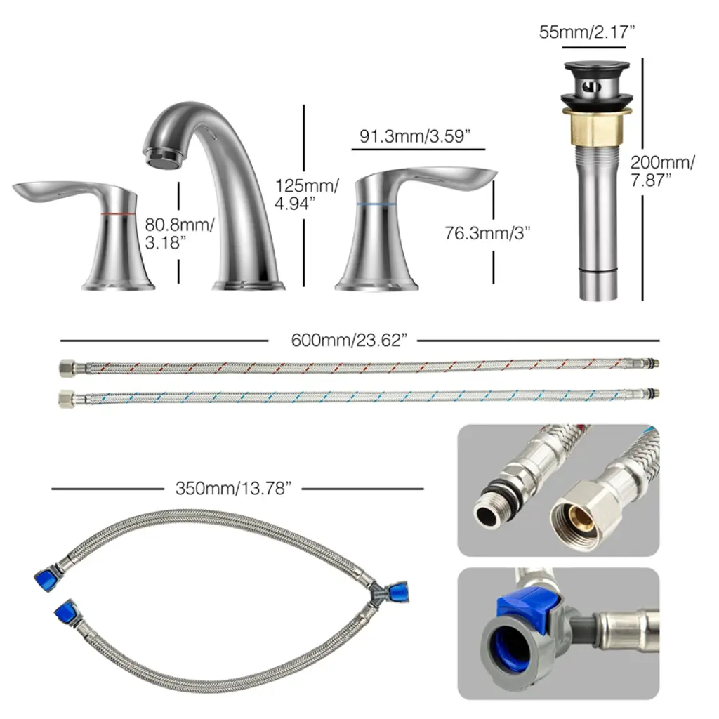 Key Features:✔ Precision Temperature Control - Dual lever handles for effortless hot/cold water adjustment✔ High-Efficiency Flow - 1.8 GPM aerated stream meets EPA Watersense standards✔ Modern Convenience - Includes pop-up drain with chrome finish✔ Complete Installation Kit - All mounting hardware + template included✔ Luxury Finish - Brushed nickel (fingerprint-resistant)Specification:Material: Zinc Alloy + PlasticProduct Height: 4.94 inches (125 mm)Spout Height: 3.18 inches (80.8 mm)Handle Height: 3 inches (76..3 mm)Handle Length: 3.59 inches (91.3 mm)Water Delivery Rate: 1.2 GPM (4.5 L/min at 60 PSI)Packing List:1 x Faucet / 2 x Faucets2 x Handles / 4 x Handles1 x Pop Up Drain / 2 x Pop Up Drains1 x Accessory Kit1 x Instruction Manual