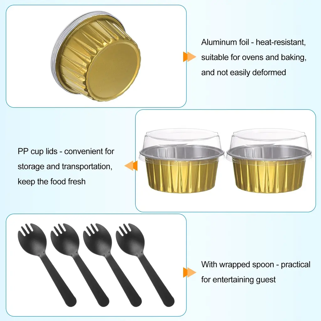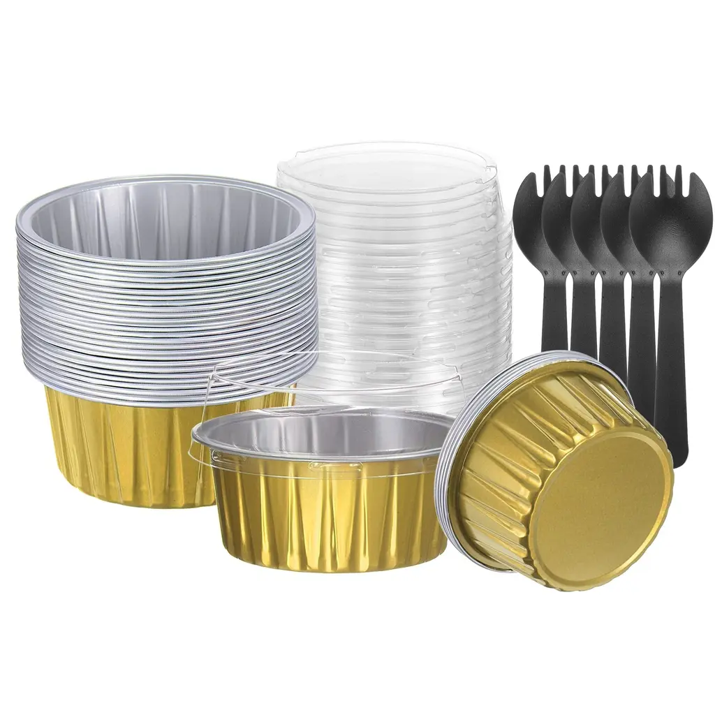 50pcs Cupcake Liners 5Oz Aluminum Foil Baking Cups With Lids Forks - Golden - Golden