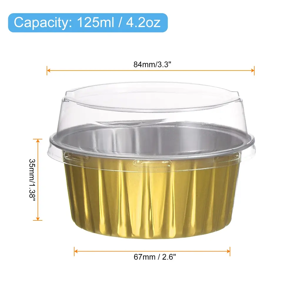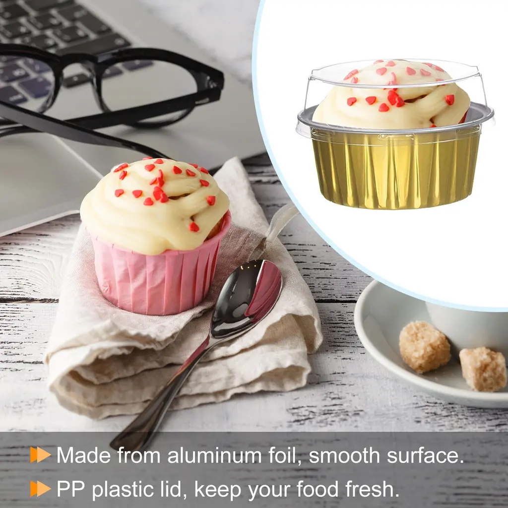The cupcake baking cups are made of aluminum foil, which is heat-resistant, suitable for ovens and baking, and not easily deformed. The aluminum foil cups have a metallic luster and an elegant appearance.PP plastic lid provides a leak-proof seal, making it convenient for storage and transportation, and helps to keep the food fresh. The lid design makes the baking cups easy to carry and store, making them suitable for takeaways and gifts.Aluminum foil cupcake cups are lightweight yet sturdy, capable of supporting the weight of various baked goods without breaking, and are easy to carry. The disposable design offers convenience and eliminates the hassle of cleaning.Suitable for various desserts and foods, such as cupcakes, muffins, pies, puddings, cheesecakes, and more, offering wide-ranging use. The aluminum foil material is heat-resistant and can be used in ovens and for baking.