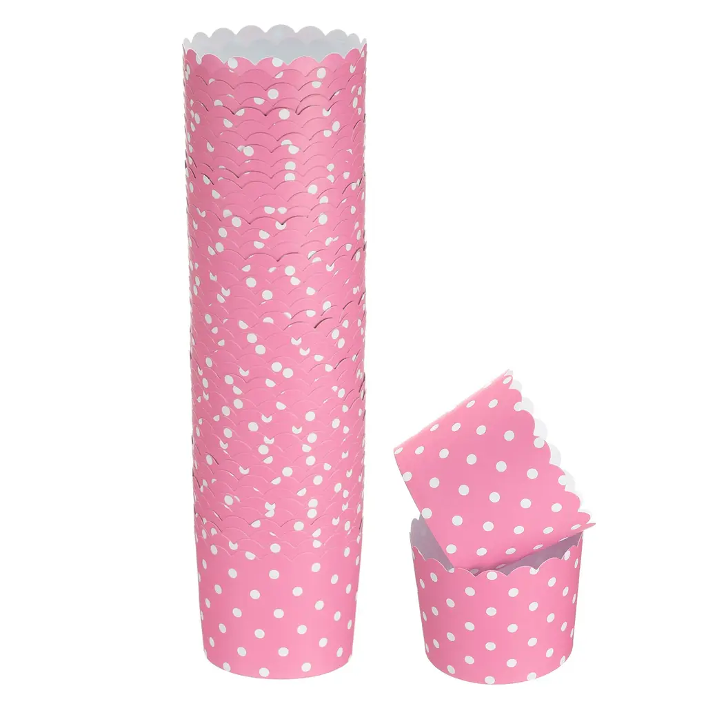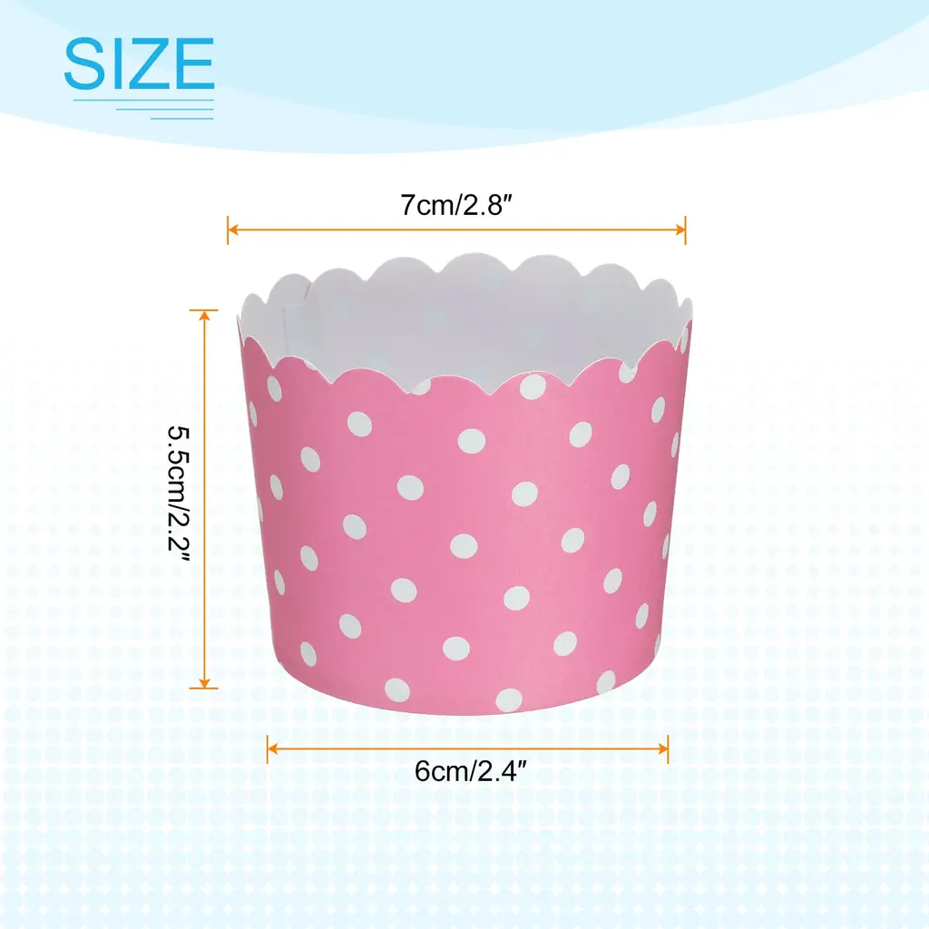 Paper baking cups are made of wood pulp and PE coating, sturdy and durable, can maintain a good shape during baking, provide support for cupcakes or muffins, and the outside remains bright and shiny when baking food.The cupcake liners are designed to be oven safe to 375°F and also suitable for microwave and freezer. It is perfect for different parties, birthdays, celebrations, baby-showers, weddings, Christmas, Halloween or Thanksgiving decorations, etc.With cute bright colors, cupcake wrappers are suitable for serving cakes, cookies, muffins, candies, nuts, pastries, ice cream and other treats, which can make your desserts, cookies and pastries more attractive and impressive.No baking pan or muffins pan required with these cupcake liners, just pour the batter into the cups, place on the baking pan, and bake and you can enjoy the delicious taste.