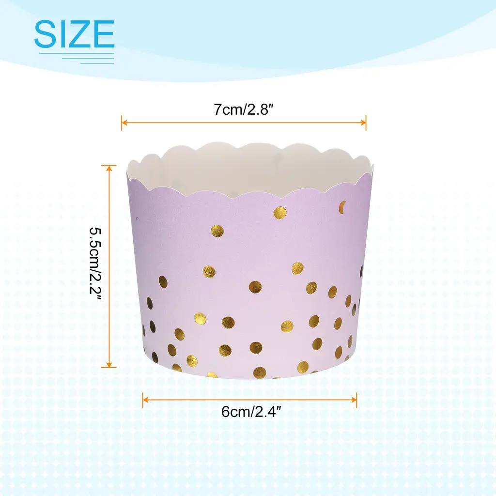 Paper baking cups are made of wood pulp and PE coating, sturdy and durable, can maintain a good shape during baking, provide support for cupcakes or muffins, and the outside remains bright and shiny when baking food.The cupcake liners are designed to be oven safe and withstand temperatures up to 220℃/420℉ and are also suitable for microwaves and freezer. It is perfect for different parties, birthdays, celebrations, baby-showers, weddings, Christmas, Halloween or Thanksgiving decorations, etc.With cute pattern and look elegant, cupcake wrappers are suitable for serving cakes, cookies, muffins, candies, nuts, pastries, ice cream and other treats, which can make your desserts, cookies and pastries more attractive and impressive.No baking pan or muffins pan required with these cupcake liners, just pour the batter into the cups, place on the baking pan, and bake and you can enjoy the delicious taste.