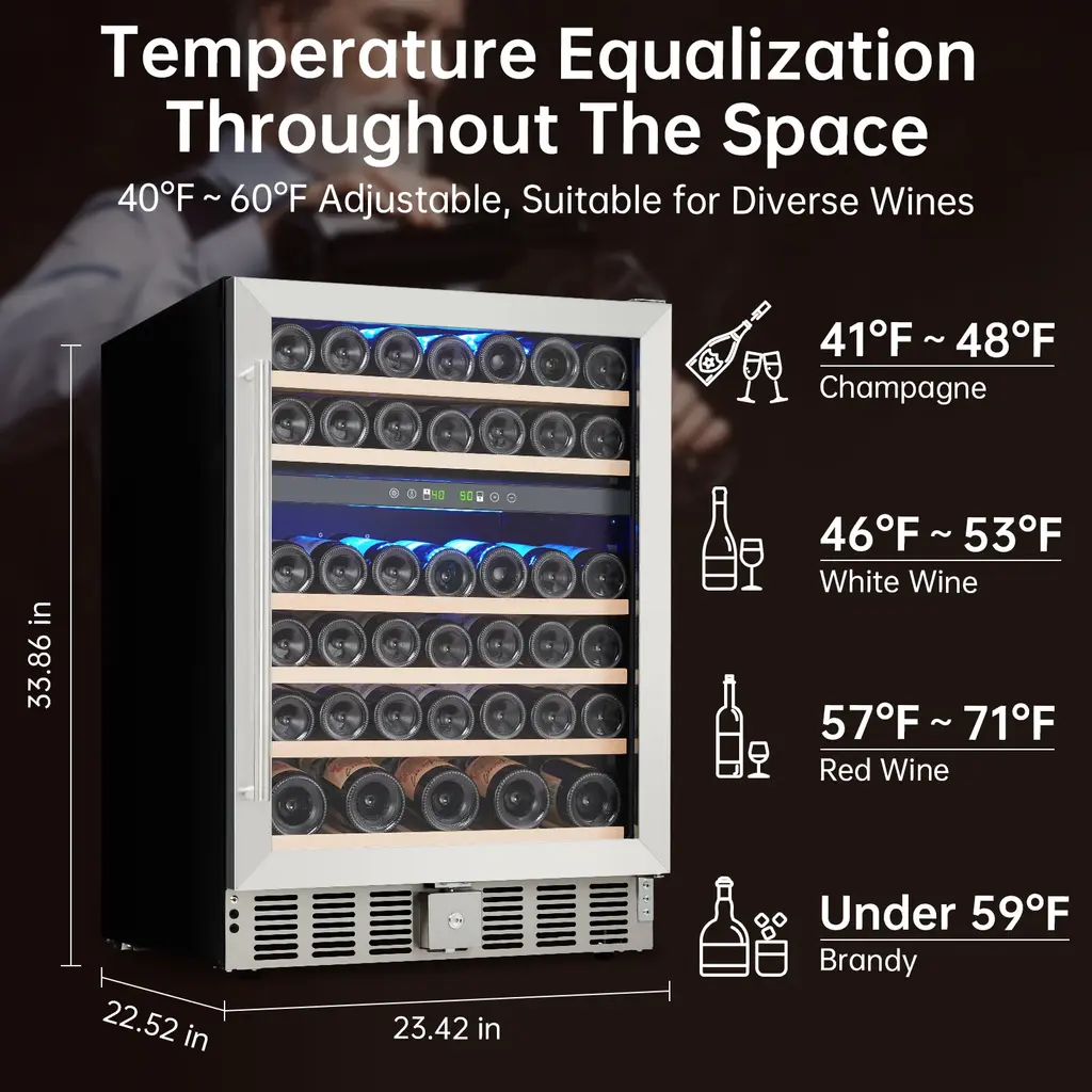 【Digital Temperature Control】52 Bottles wine refrigerator can adjust the storage temperature through LED digital display touch panel settings. You can accurately control the temperature at any temperature between 40~64°F, cooling quickly without frost. 【52 Bottles Large Capacity】The wine cooler cabinet is equipped with 6 removable all-wooden shelves, which can store up to 52 bottles of 750ml standard bottles of wine. The wooden shelves can be easily removed or repositioned at will to help you accommodate larger bottles of champagne, bubble wine, etc. 【Air-Cooled Constant Temperature】 Our wine fridge uses an advanced compression cooling system with a built-in fan to maintain air circulation, keeping the internal temperature and humidity balanced, allowing your wine to age gracefully as if it were stored in a wooden barrel in the cellar of a winery. 【Soft Blue LED】The equipped blue LED lighting is convenient for picking up wine at night, while the warm lighting atmosphere can display the wine beautifully, and the soft warm light will not affect the flavor of the wine. 【Stainless Steel Body + Safety Lock】 Made of solid stainless steel material, the safety lock design prevents children from taking out the red wine while playing, and the 4 foot pads can rotate to adjust the height to adapt to uneven floors. Specification: