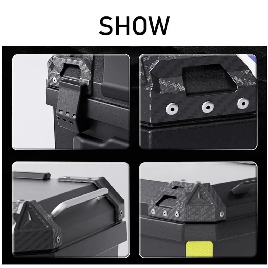 "Motorcycle Top Case ¨C 57L Aluminum Lockable Storage Box with Baseplate (TruAIR Brand, Black)"Product Details & Specifications:Premium Aluminum ConstructionMade from high-quality aluminum alloy for durability and lightweight performance (4,124g)Black finish with integrated reflective strips for enhanced visibilitySpacious & Organized Storage57L capacity ¨C fits full-face helmets, riding gear, and essentialsRemovable shock-absorbing liner for easy cleaningWeatherproof & SecureWaterproof and dustproof design with sealed seamsLockable system with baseplate for theft preventionSafety & ProtectionAnti-drop corner guards prevent damageReflective strips improve nighttime safetyEasy Installation & UseTool-free mounting system ¨C no drilling requiredUniversal fit for most motorcycles and scootersBrand: TruAIRMaterial: AluminumColor: BlackWeight: 4,124 gSpecial Features: Waterproof, Lockable, Reflective Strips