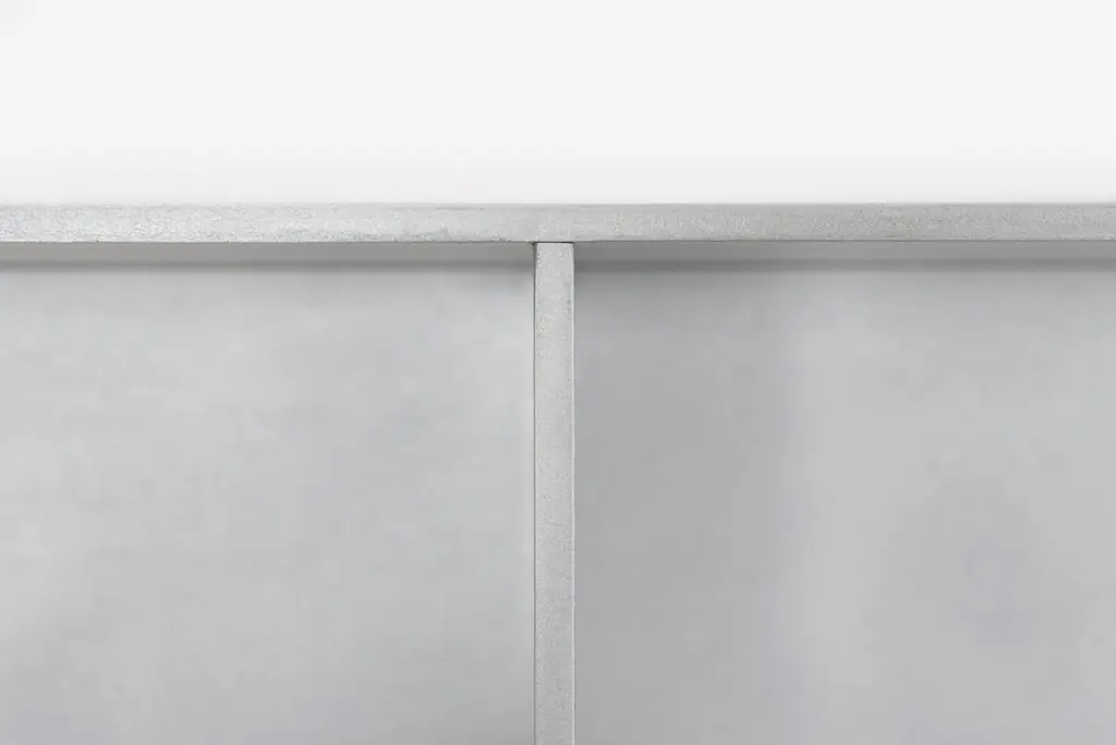 The Minimalist wall-mounted, 91 wide, 5G shelf is sculpted out of 1/4 inch thick, wax-polished aluminum. Each shelf has an inset welded U-channel that spans the length of the shelf and easily mounts on included custom-bent steel Z-clips. Each bay of this modernist shelf is proportioned to the golden ratio and can the scale can be customized to match these proportions. The shelf is customizable based on these proportions and can be in 2, 3, 4, 5, 6, 7 and 8 bays. Finish samples, available upon request.