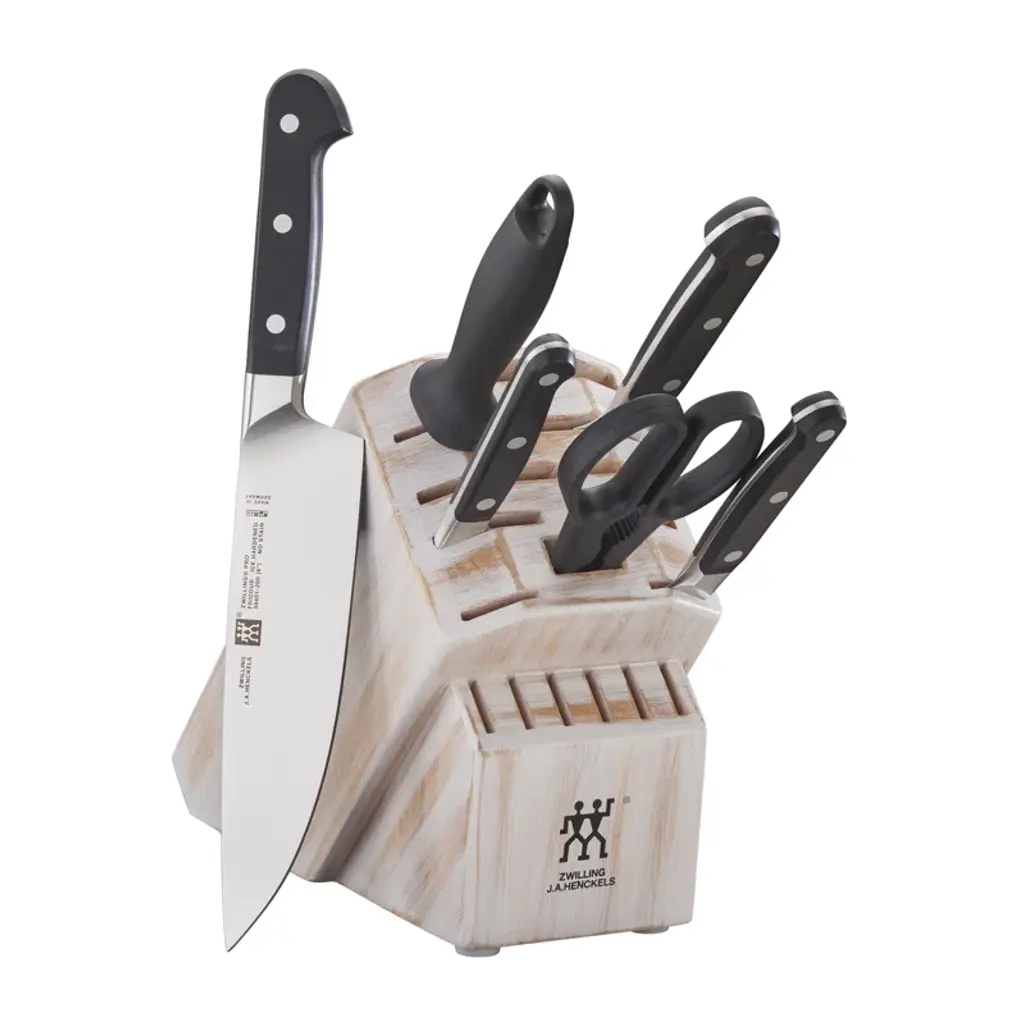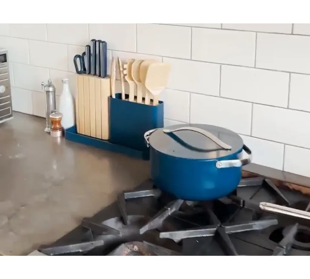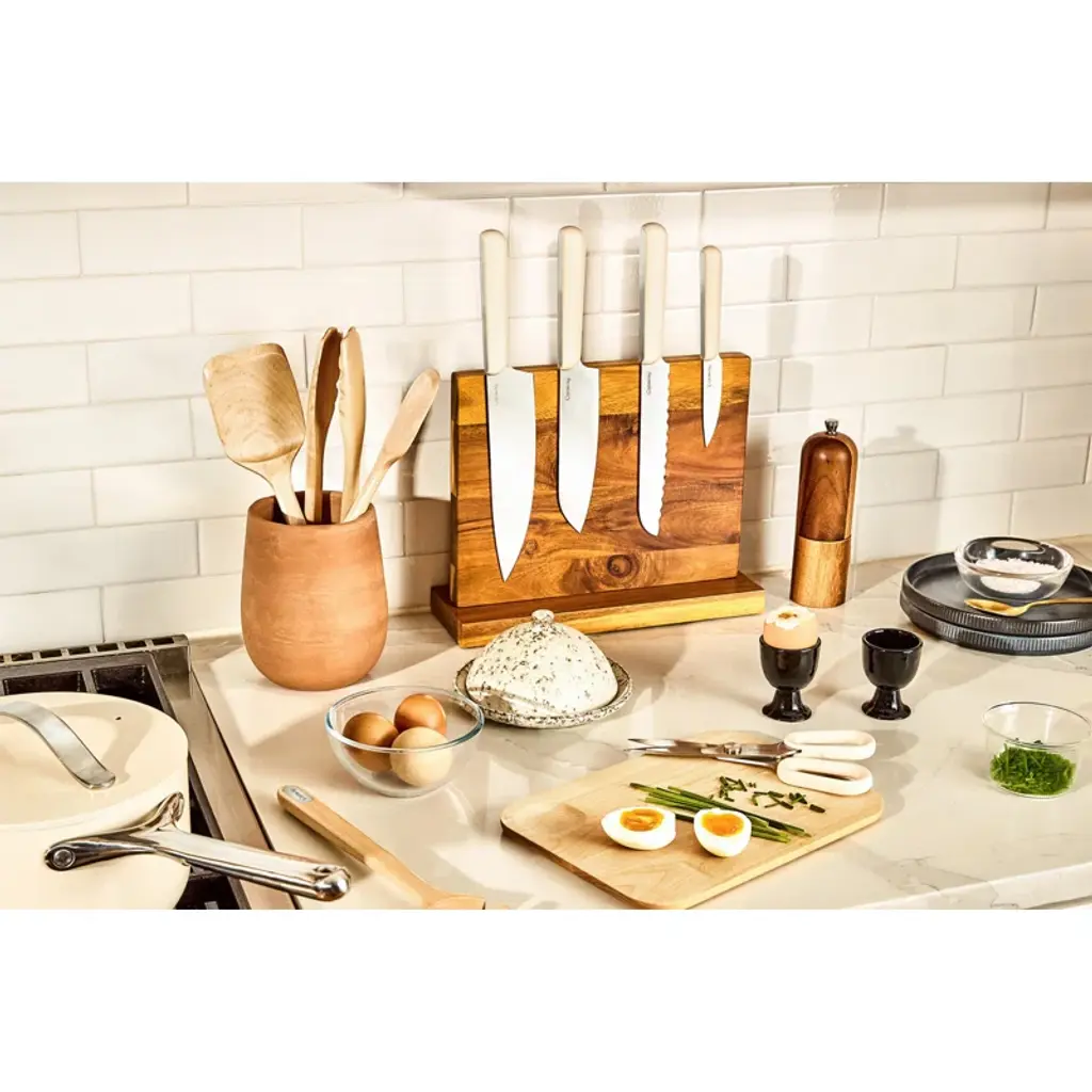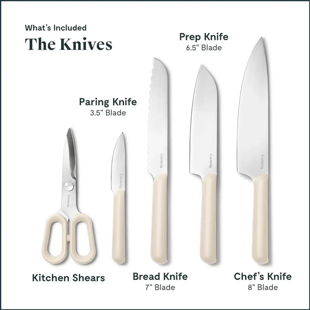 Stay sharp in the kitchen. Our Chef's Knife, Prep Knife, Bread Knife, and Paring Knife are crafted with premium German Stainless Steel blades and have a professional-grade Rockwell Hardness score of 58+. The Kitchen Shears, which can detach for easier cleaning, add further versatility for quickly snipping herbs or slicing open your meal kit delivery box. With balanced weight and an ergonomic design, you'll be able to easily chop anything on the menu.